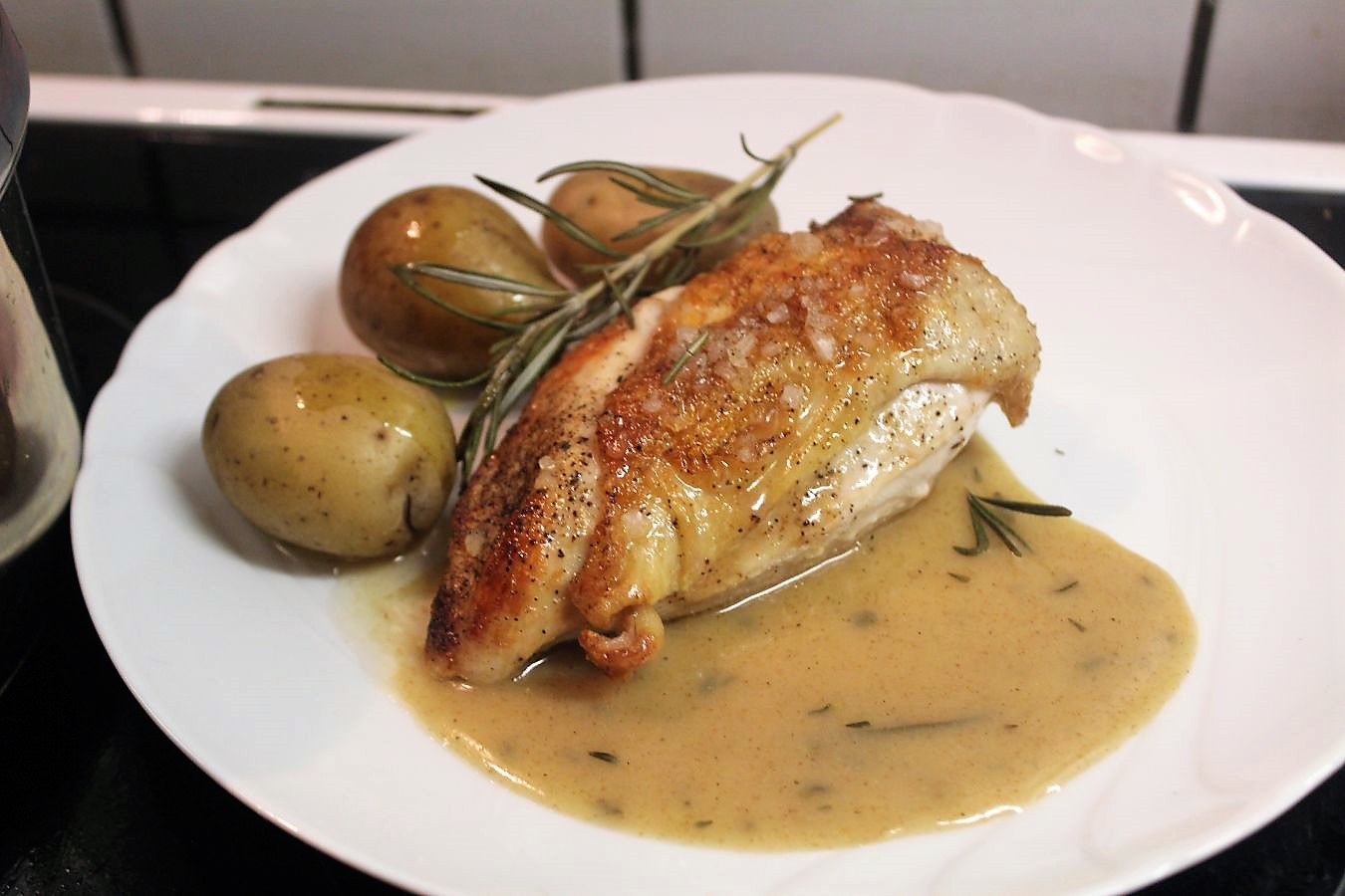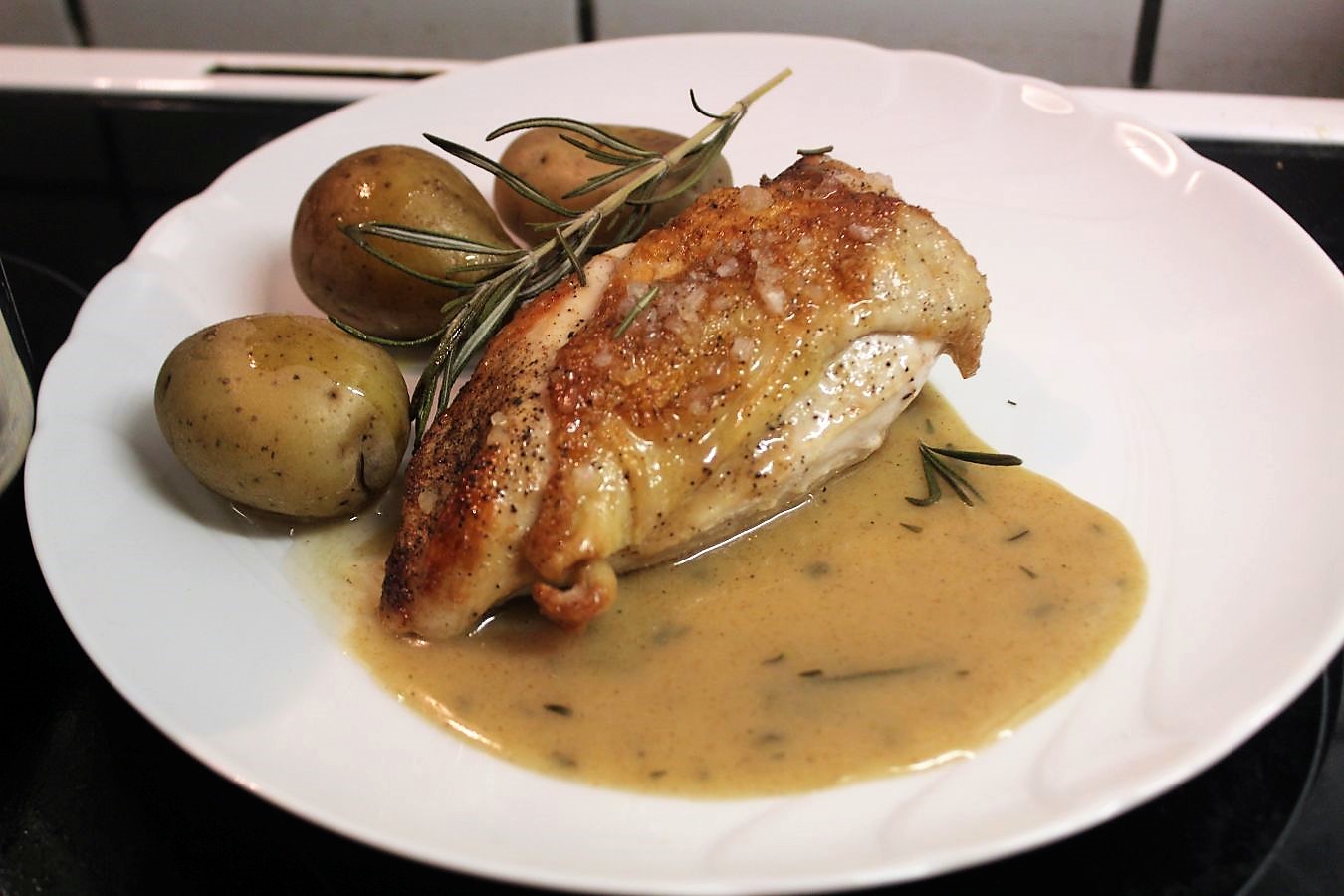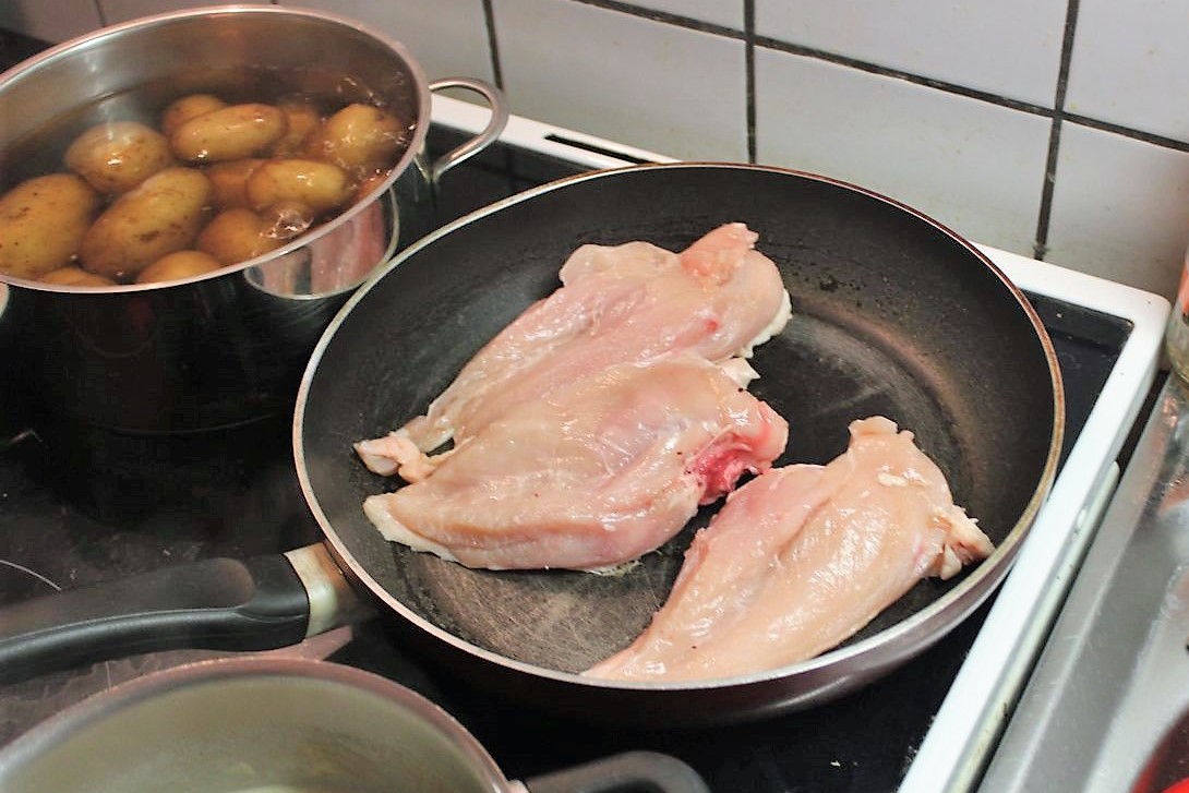Die Hähnchenbrüste sind mit Haut. Das finde ich gut, dann kann ich ohne Zugabe von Bratfett arbeiten und das Fleisch wird generell saftiger, als wenn man es ohne Haut brät.