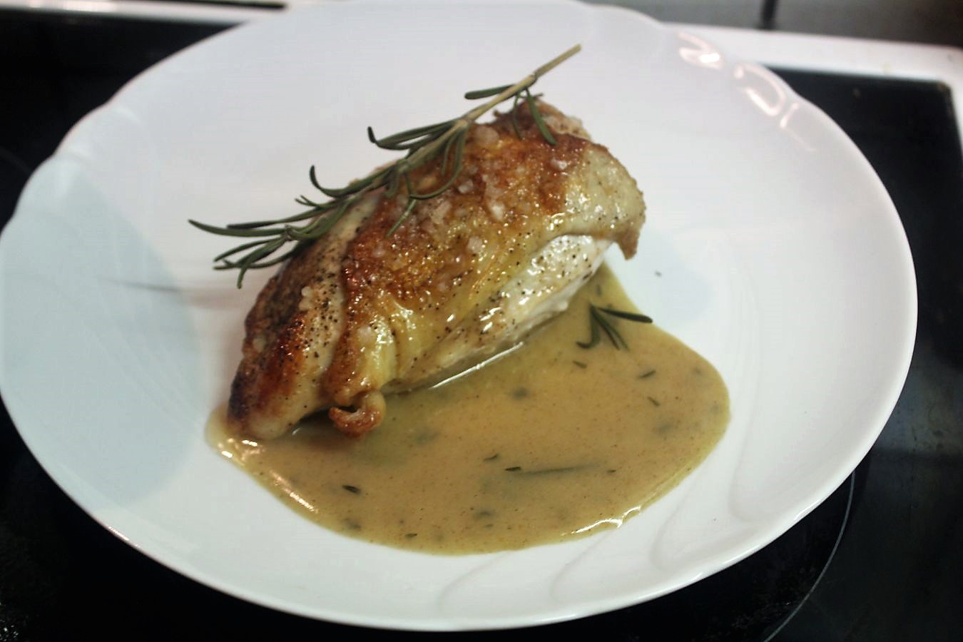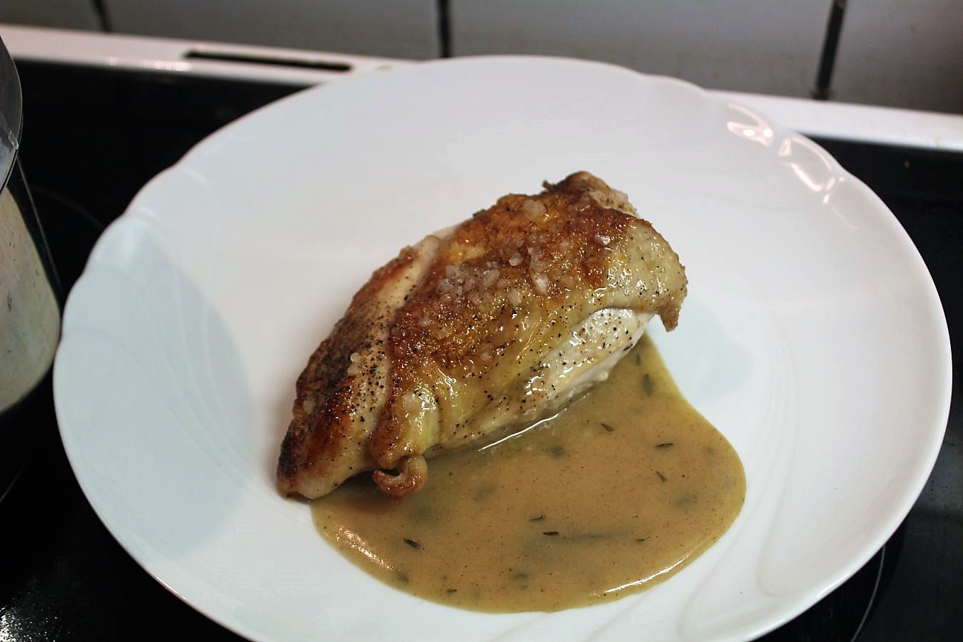 Drei Minuten pro Seite braten, dann ist das Fleisch innen, aber noch lange nicht durch, sondern für Huhn ungenießbar irgendwo zwischen noch kalt und medium. Deswegen kommt das Fleisch nach dem Braten noch in den vorgeheizten Backofen.
