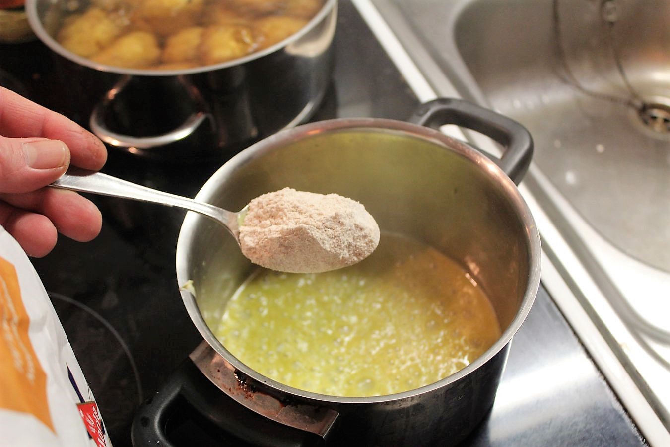 Einen gehäuften Esslöffel Mehl zur Butter geben und beides zusammen anschwitzen lassen.