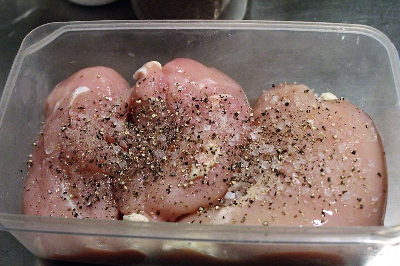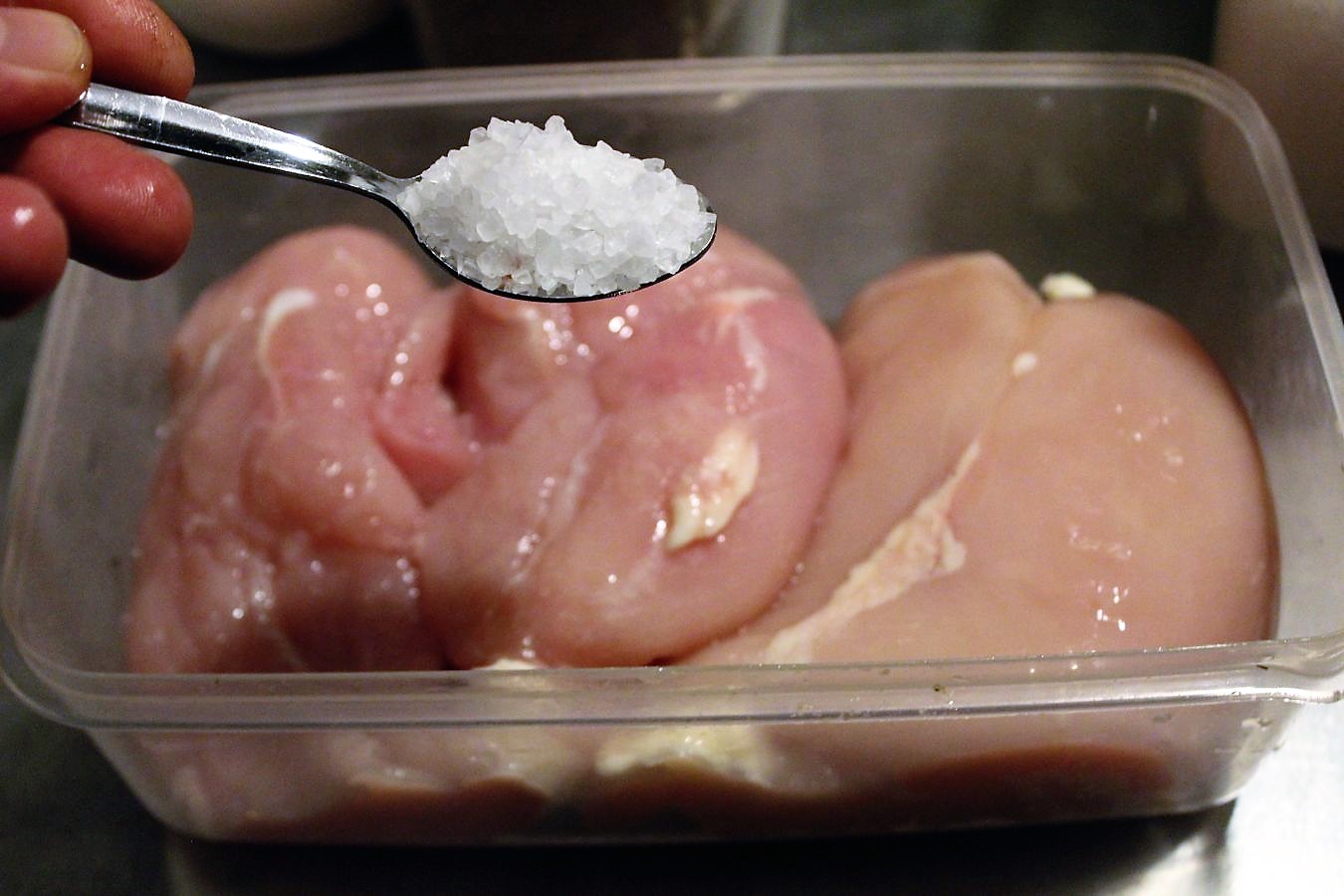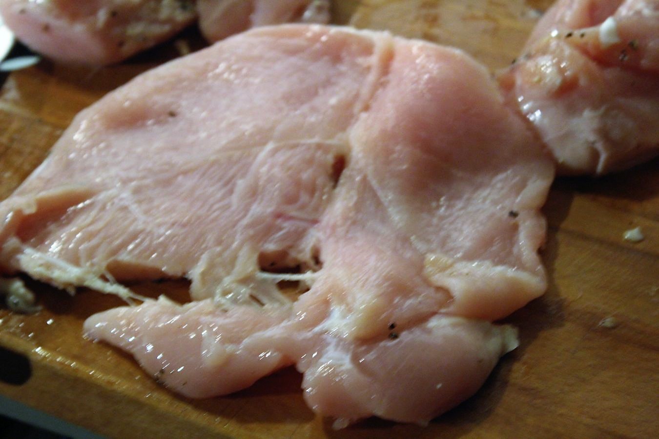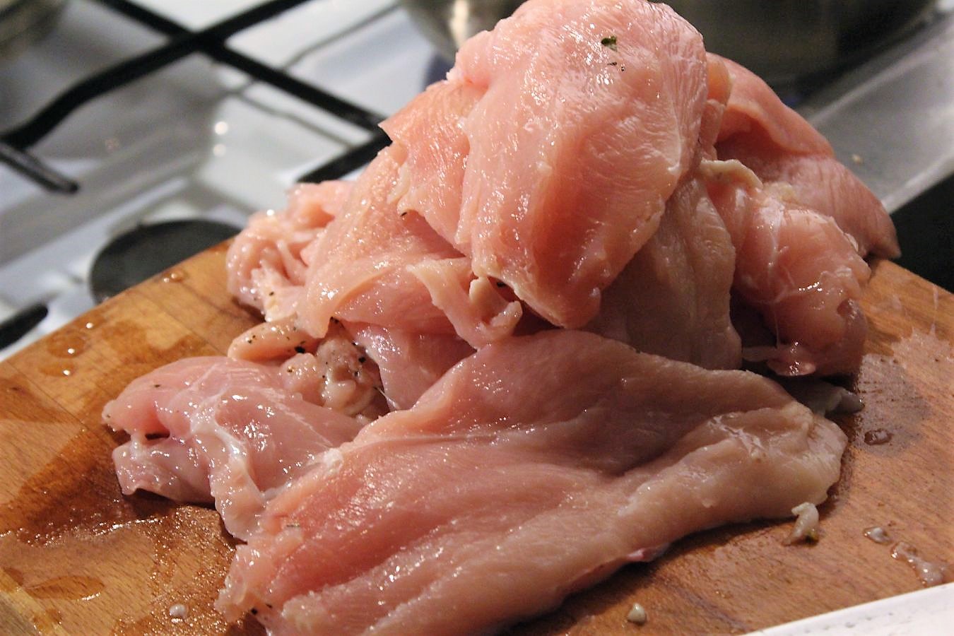 Danach das Fleisch erneut dünner schneiden. Bei Hähnchenbrust geht das ganz gut, weil sie von Haus aus recht dick ist.