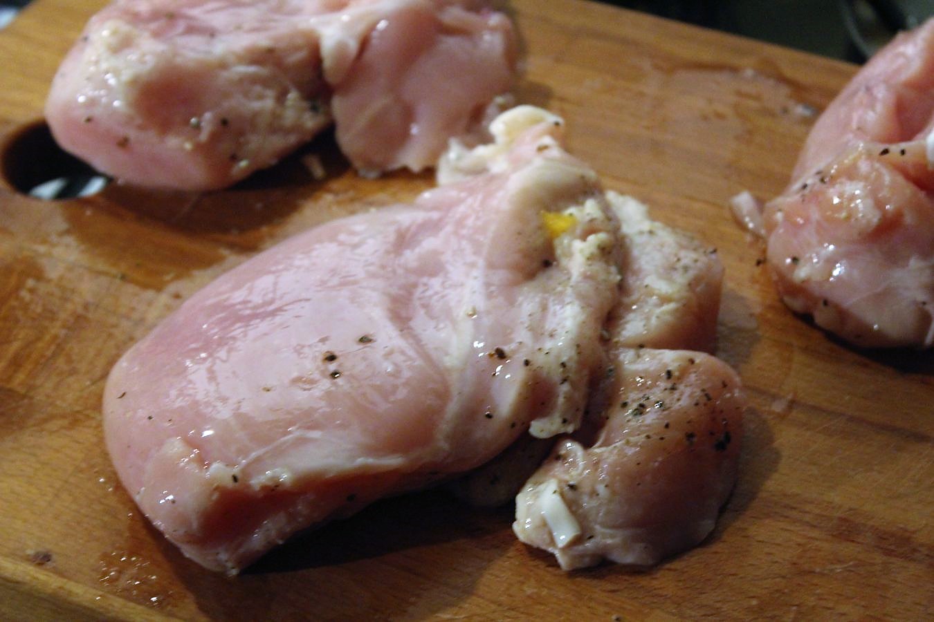 Die Hühnerbrüste trennen und mit einem scharfen Messer dünn aufschneiden.