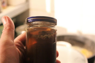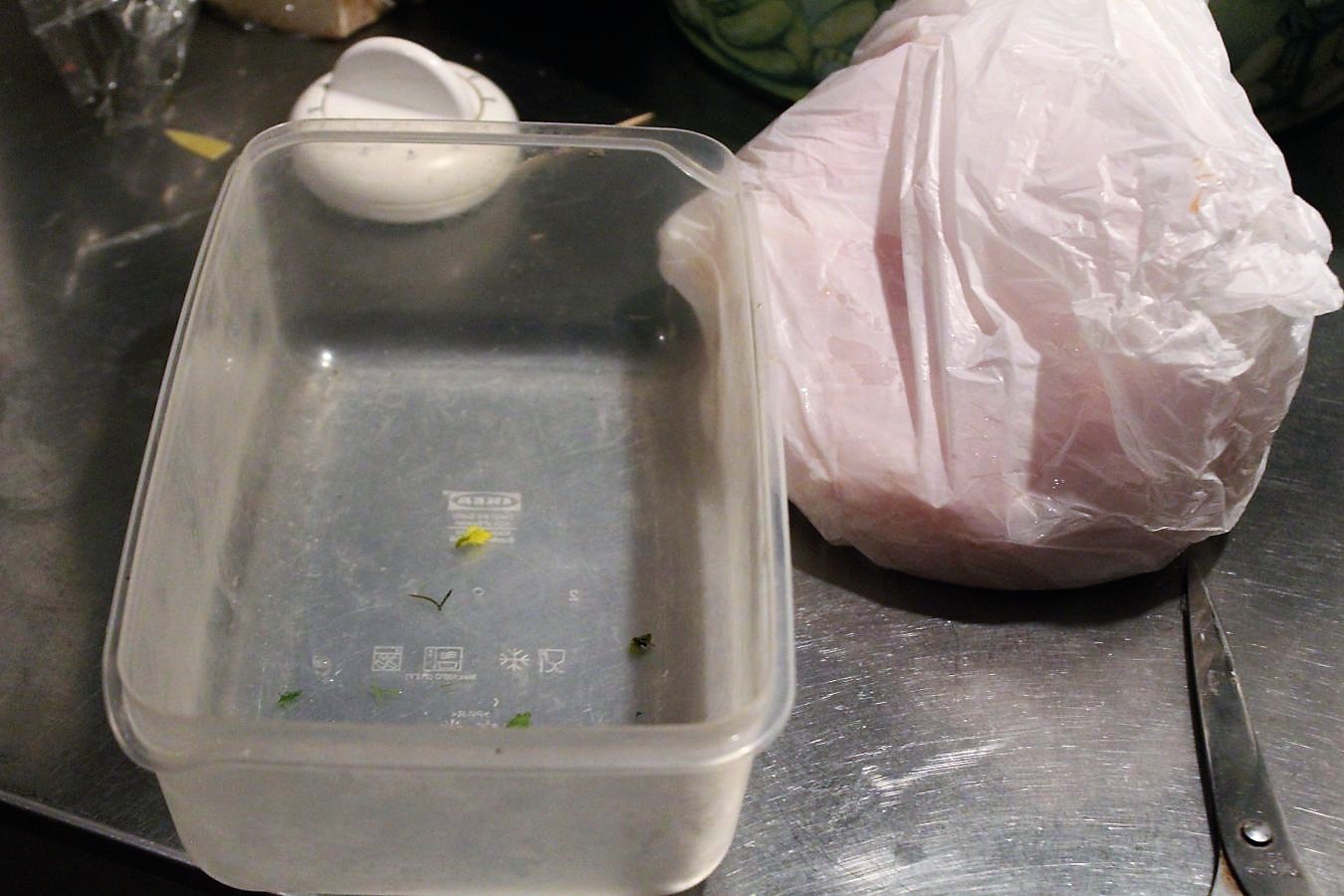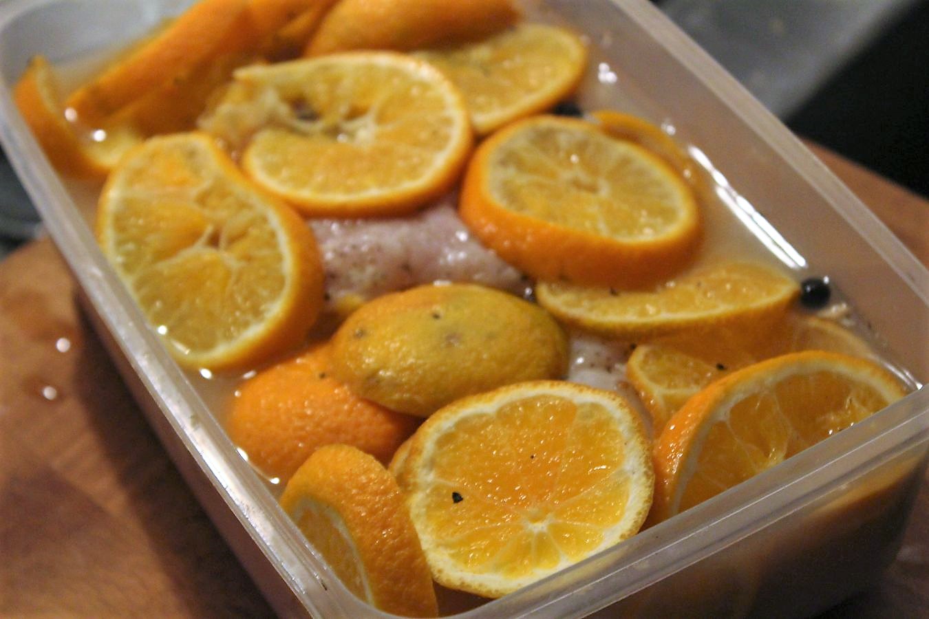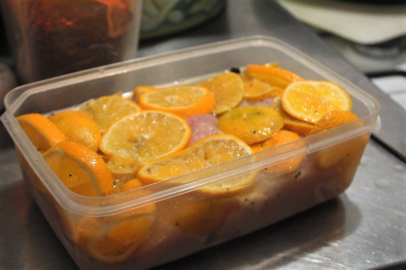 Jetzt ist vier Tage später und so lange habe ich das Fleisch in der Marinade durchziehen lassen. Man sagt, dass Marinade einen Zentimeter pro Tag in Fleisch einzieht. Das ist jetzt also einmal richtig durch.