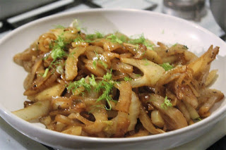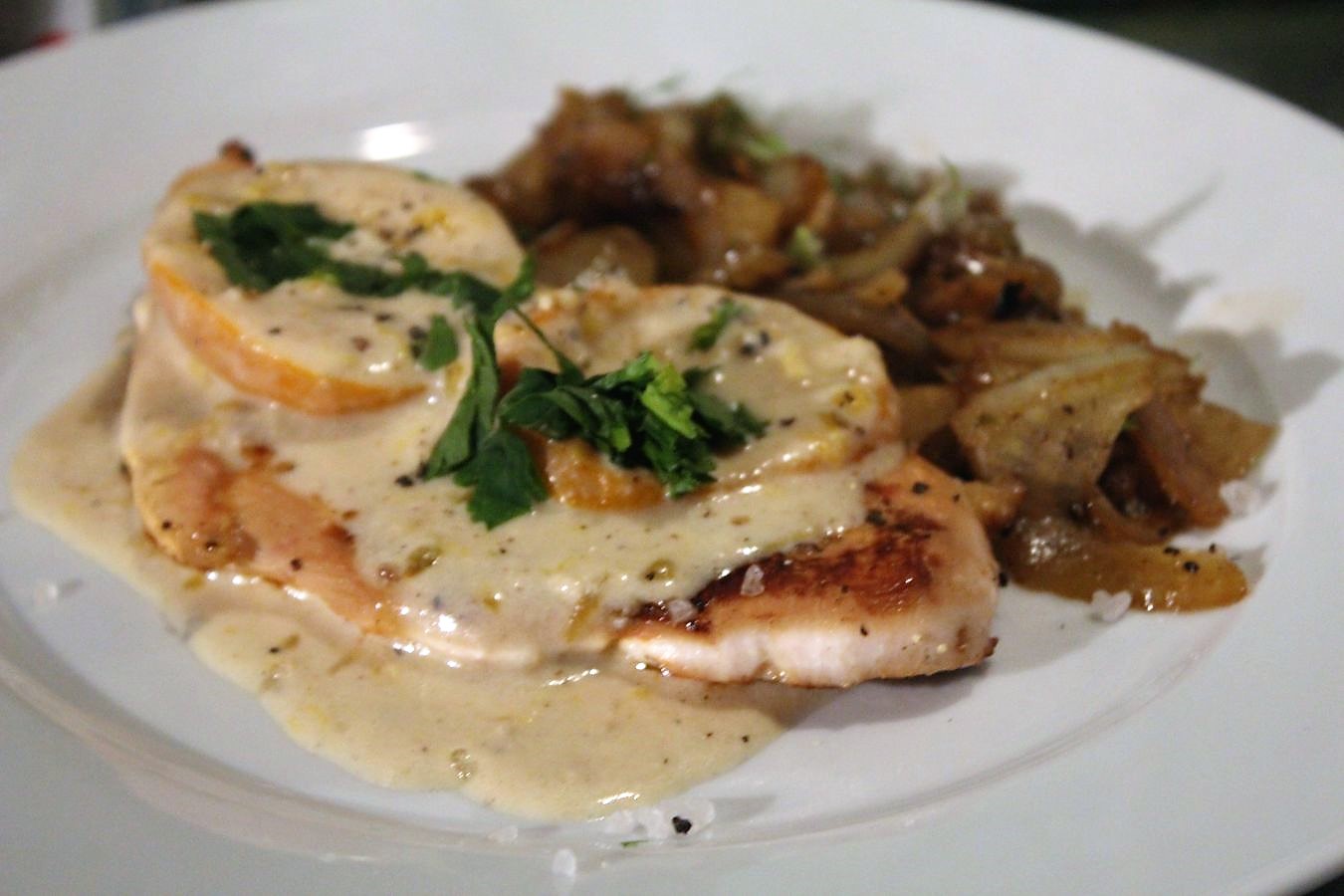 Zartes Fleisch, tolles Aroma der sahnigen Mandarinensoße und toller Fenchel auf einem Teller.