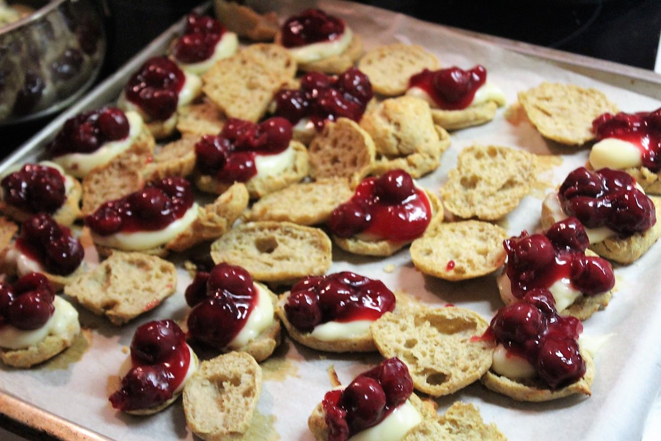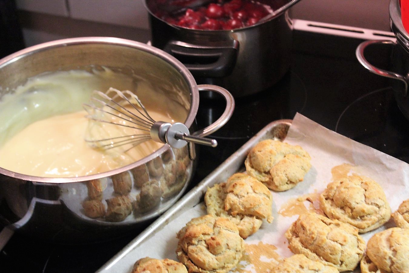 So, jetzt ist alles am Start, die Windbeutel sind aufgeschnitten, der Pudding ist kalt und die Sauerkirschen können auch noch lauwarm sein, damit sie sich besser am Pudding haften.