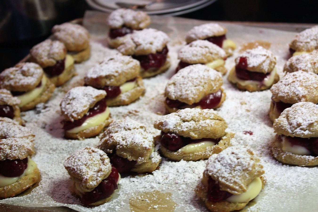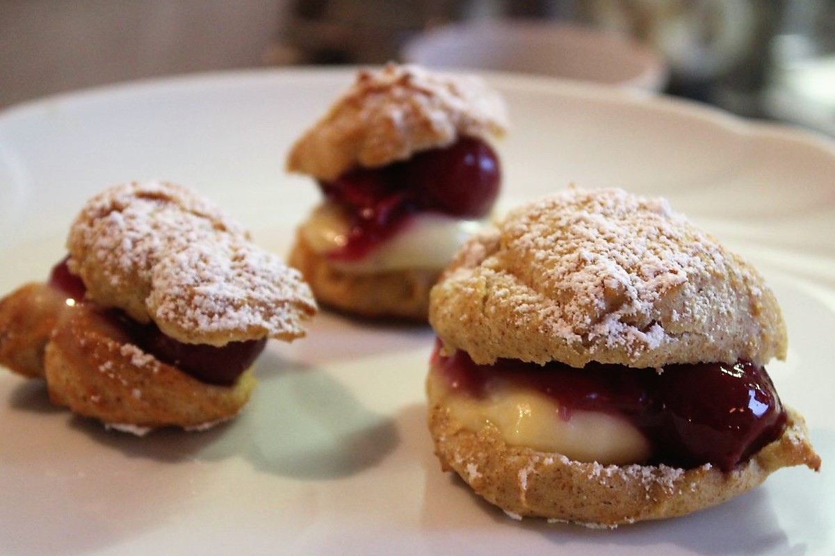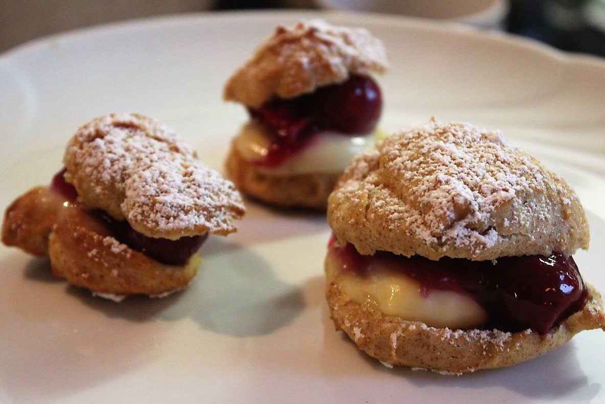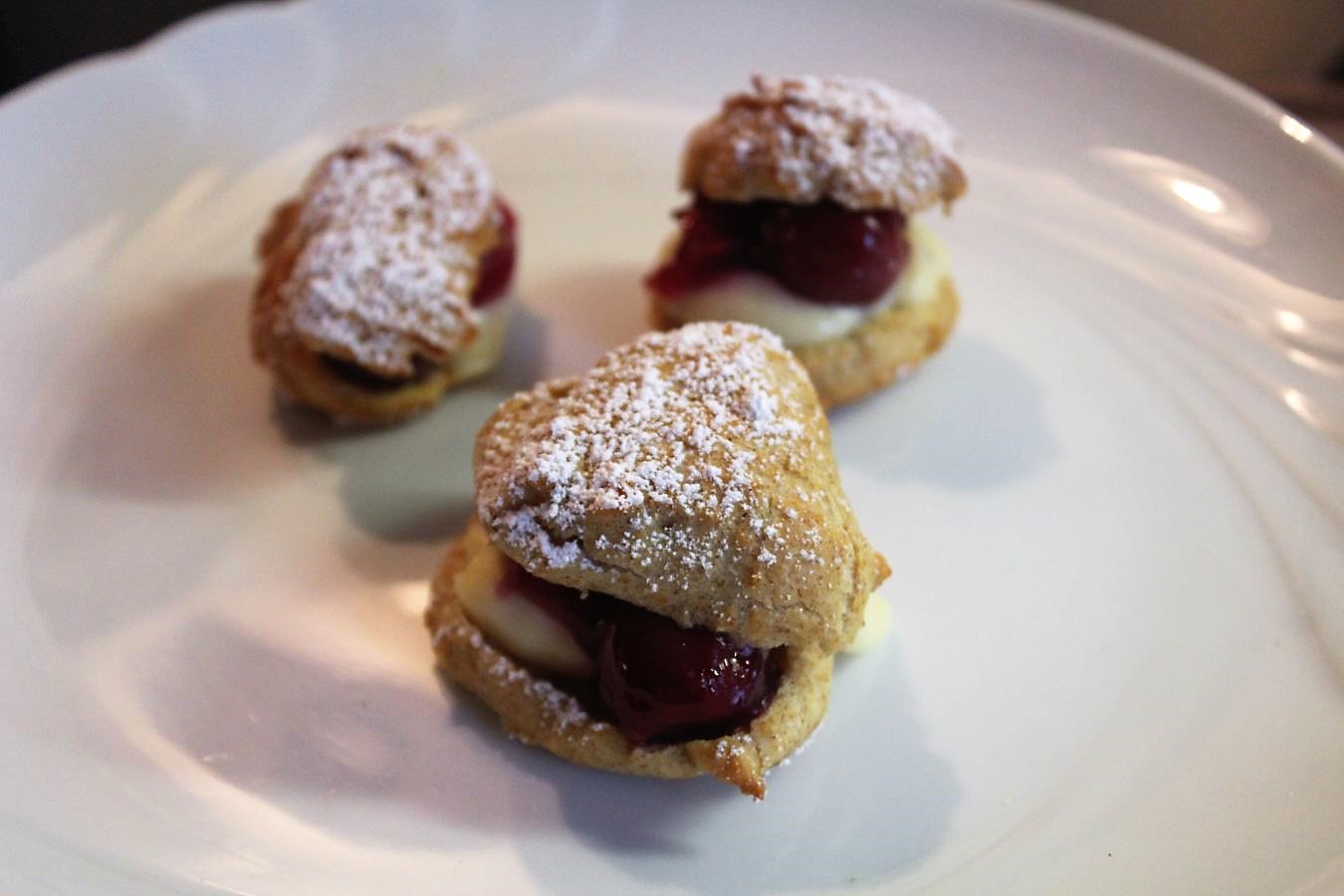 Und hier kommen meine kleinen Windbeutel. Die sind saulecker. Der Teig ist ein Brandteig, gefüllt mit Pudding und Sauerkirschen, getoppt von Puderzucker. Da ist richtig Karneval im Mund. Das ist genau mein Geschmack und meine Welt.