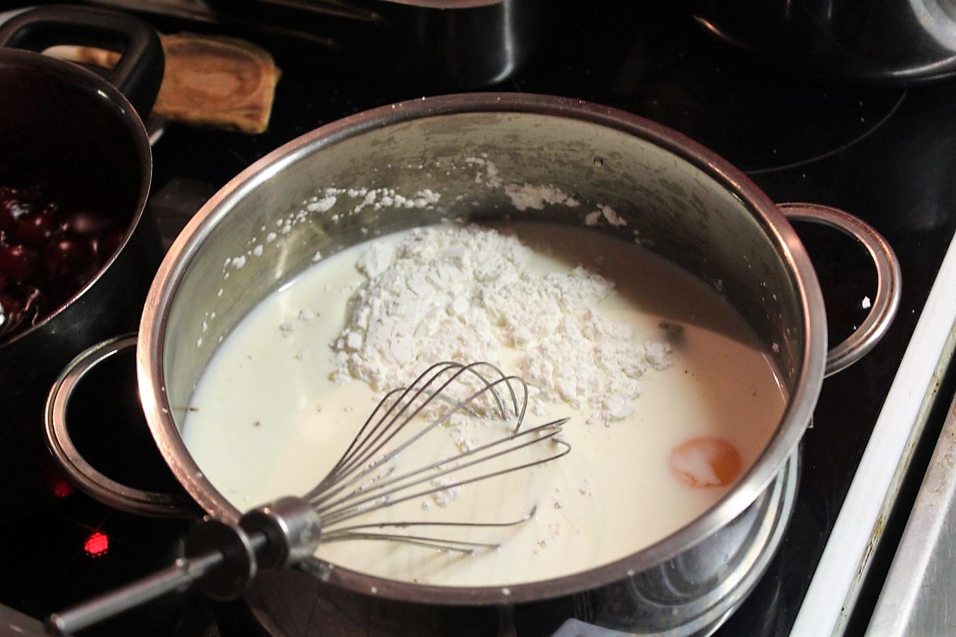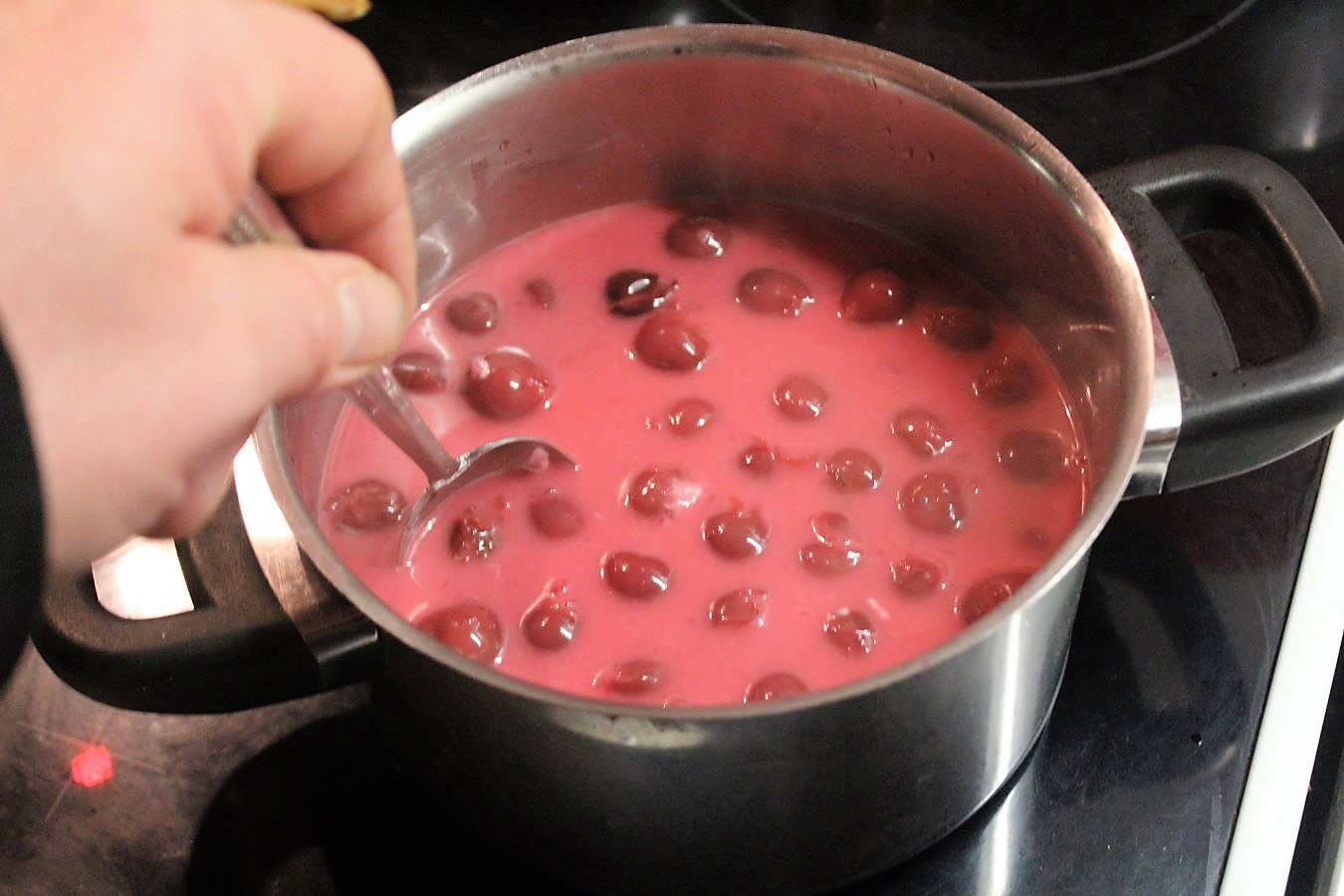 Durch die Stärke werden die Kirschen erst so milchig, aber wenn die heiß werden, wird die Masse wieder klar und zieht sofort an. Runter vom Herd abkühlen lassen, probieren ob es Euch so schmeckt und ansonsten mehr Zucker, oder Säure dazu geben.