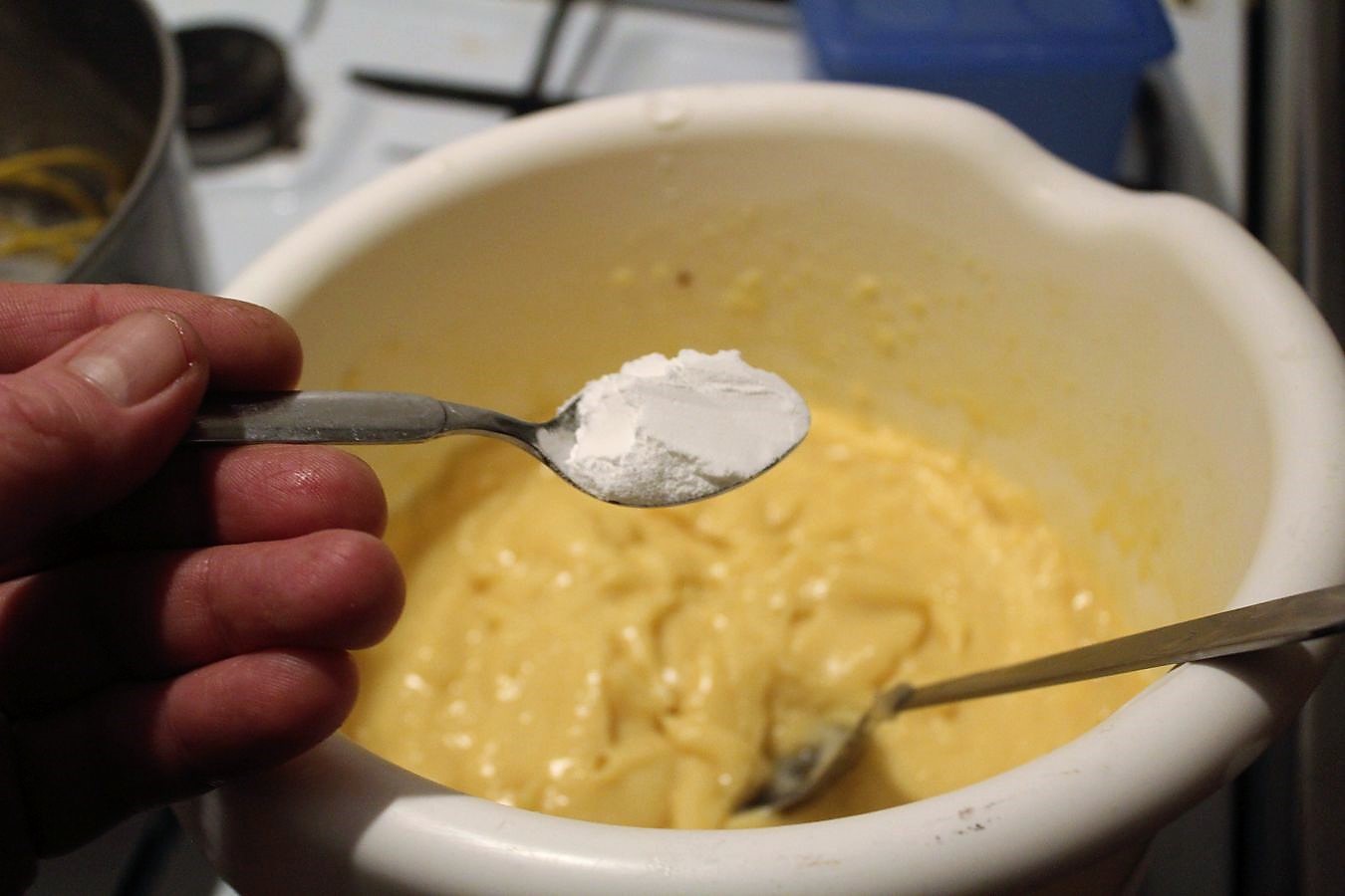 Also einen Teelöffel Backpulver in den erkalteten Teig rühren.
