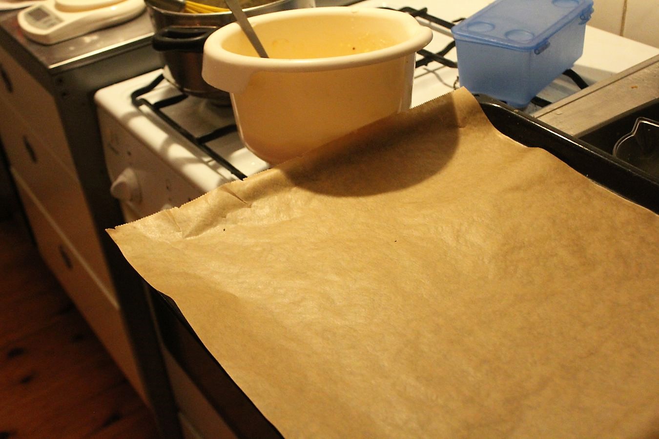 Ein Backblech mit Backpapier auslegen.