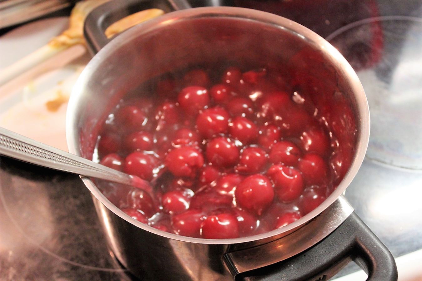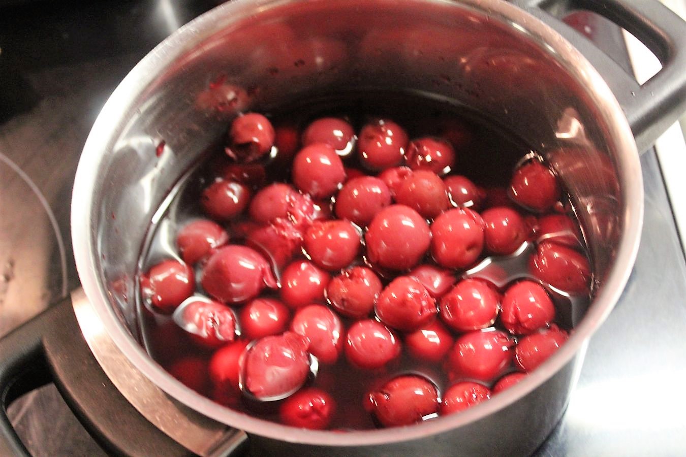 Ich mache jetzt noch schnell die Füllung für die Windbeutel. Viele nehmen ja klassisch Schlagsahne, aber das mochte ich als Kind schon nicht. Aber ich mochte schon immer eine Füllung mit Sauerkirschen. Ein großes Glas Sauerkirschen auf dem Herd erhitzen.