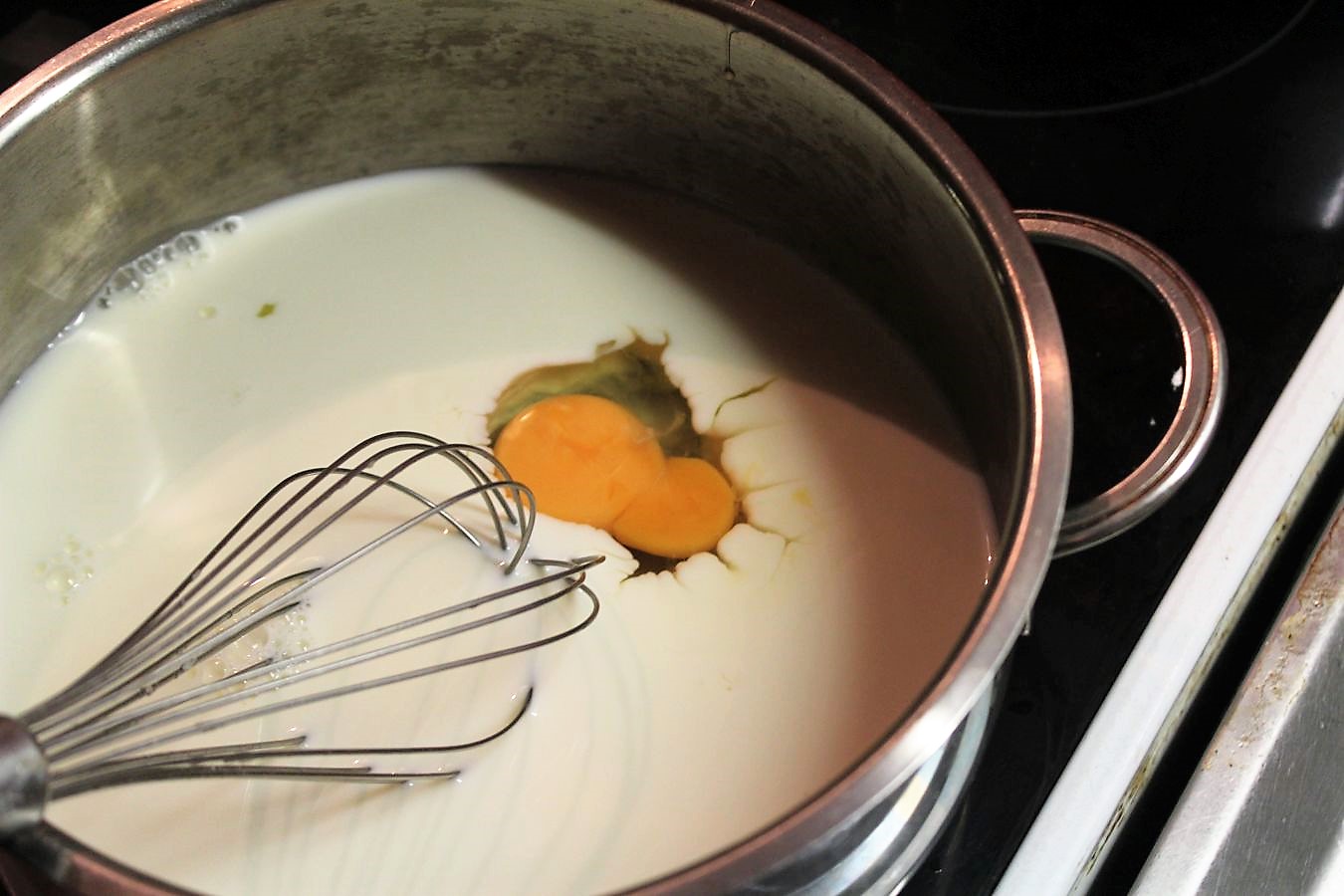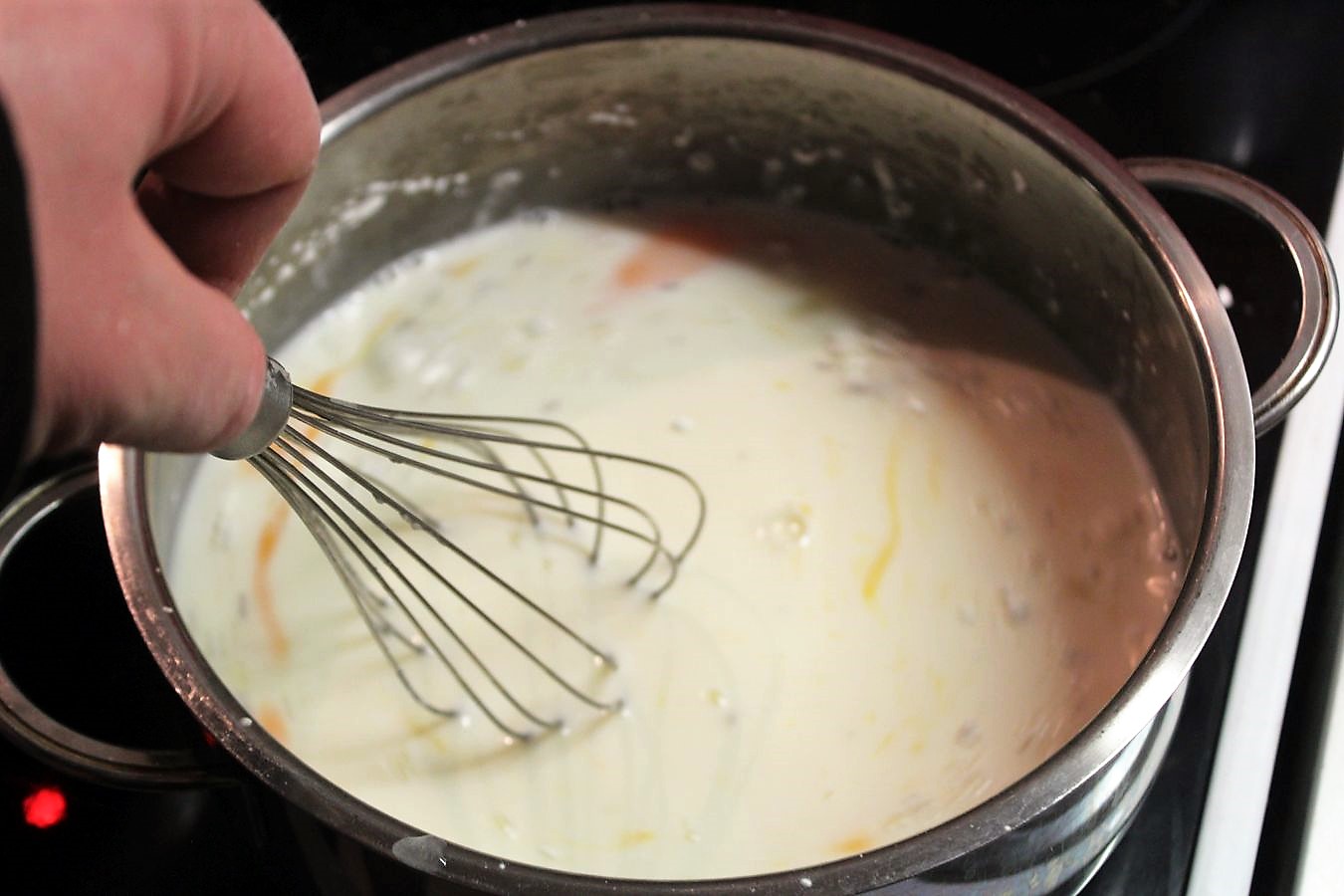 Immer mit dem Schneebesen rühren, damit nix klumpt oder anbrennt.