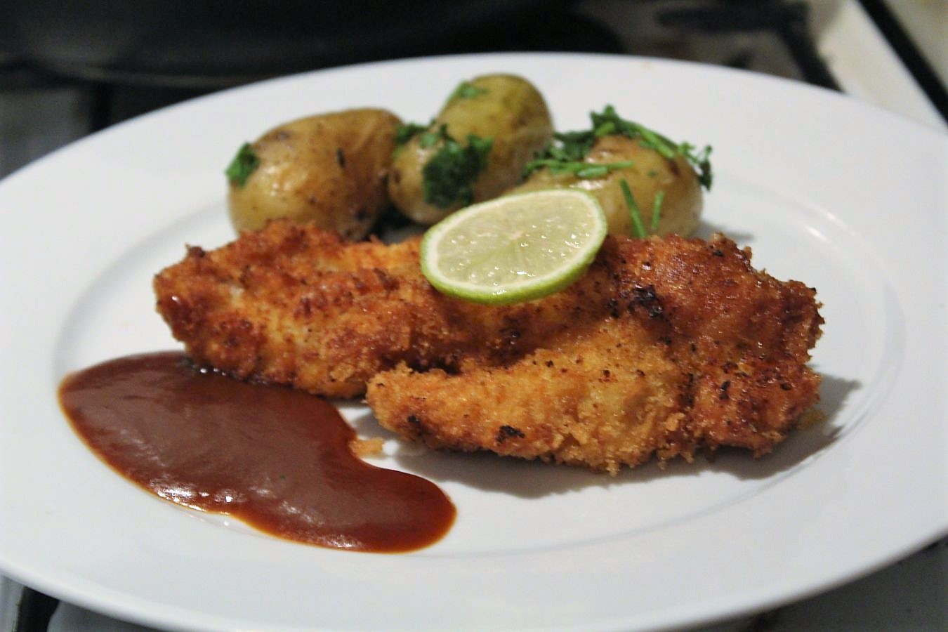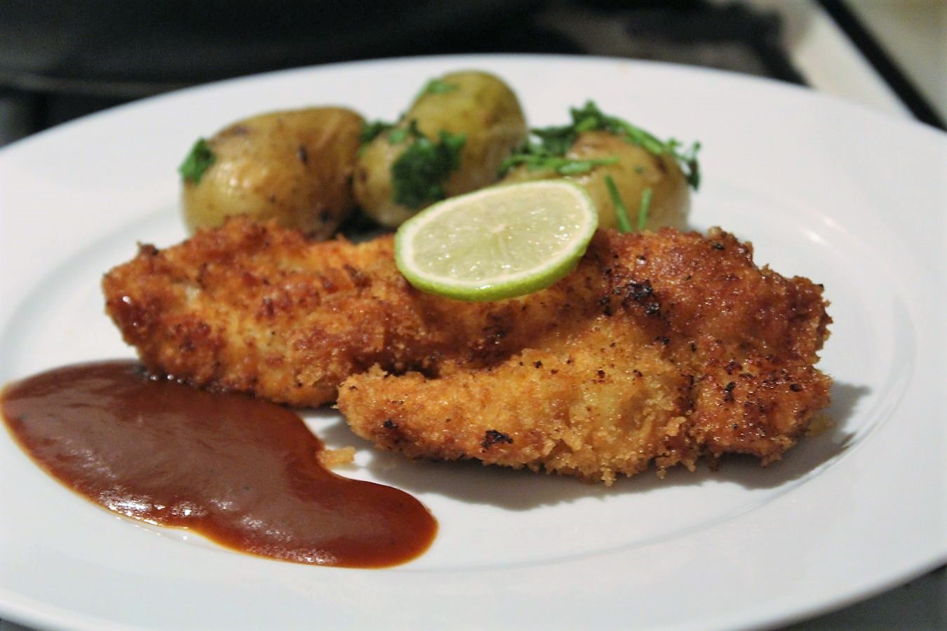 Ich fasse dann mal eben zusammen, knusprige Panierung, zartes Fleisch, leckere Soße in sicherer Entfernung, leckere Kartoffel und in einer Stunde am Tisch. Läuft bei mir.