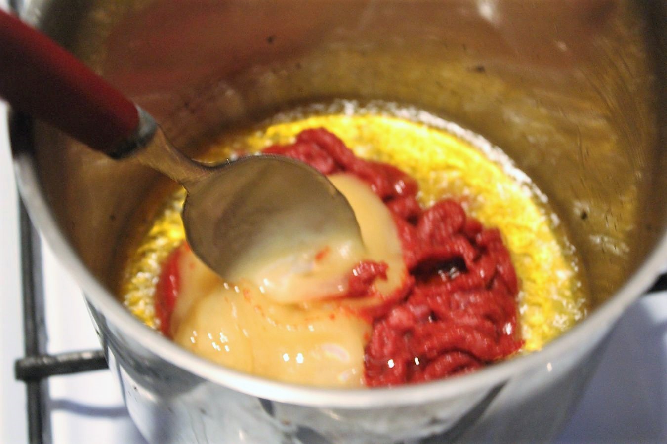 Die Barbecuesoße muss 20 Minuten einkochen, deswegen mache ich die jetzt parallel auf einer kleineren Herdplatte. Die kann man aber auch schon fertig im Kühlschrank stehen haben, oder eben so wie ich, jetzt live machen