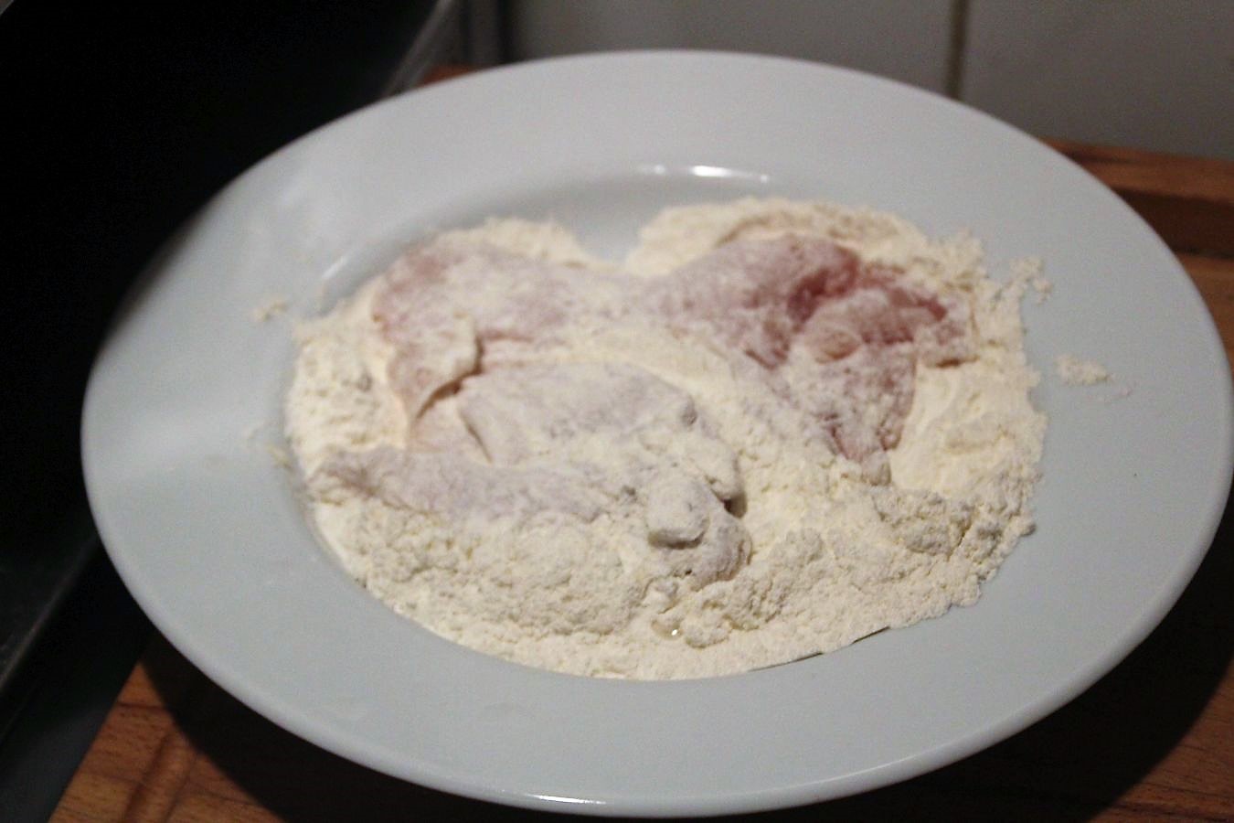 Zum Panieren nehme ich das drei Teller System. Einen tiefen Teller Mehl, einen Teller mit verquirltem Ei, einem Schuss Milch, Salz, Pfeffer und einem tiefen Teller Paniermehl, mit einer Paniermehlreserve, weil man davon mehr braucht, als in einem Rutsch in den tiefen Teller passt. Das Paniermehl habe ich selbst aus alten Baguettes und Brötchen gerieben. Ich wollte das auch nie glauben, aber es schmeckt viel besser und wird viel knuspriger als mit gekauftem Paniermehl