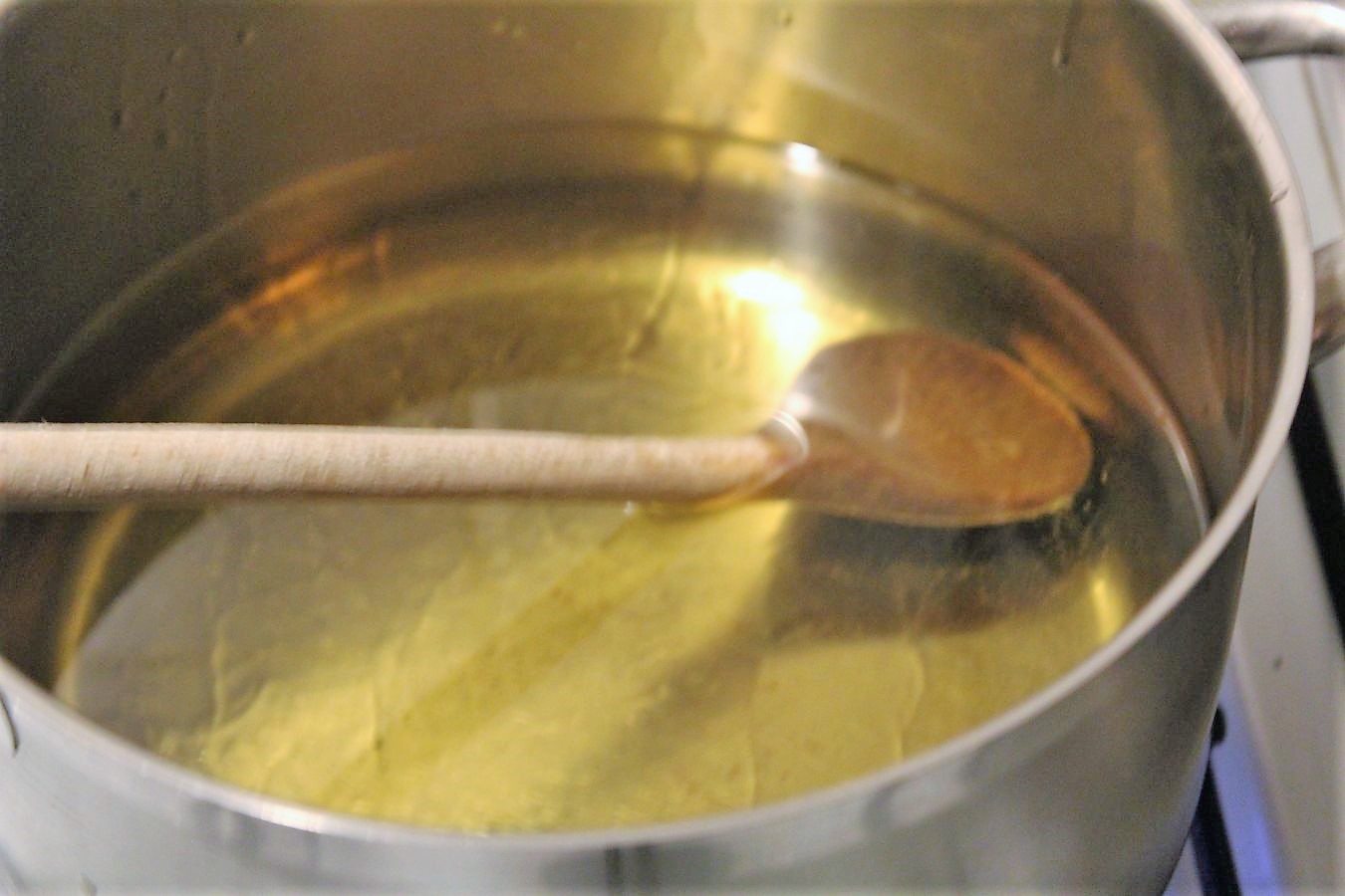 Wenn daran die Fettblasen sprudelnd aufsteigen, dann hat das Fett die richtige Temperatur zum Ausbacken der Quarkbälle.
