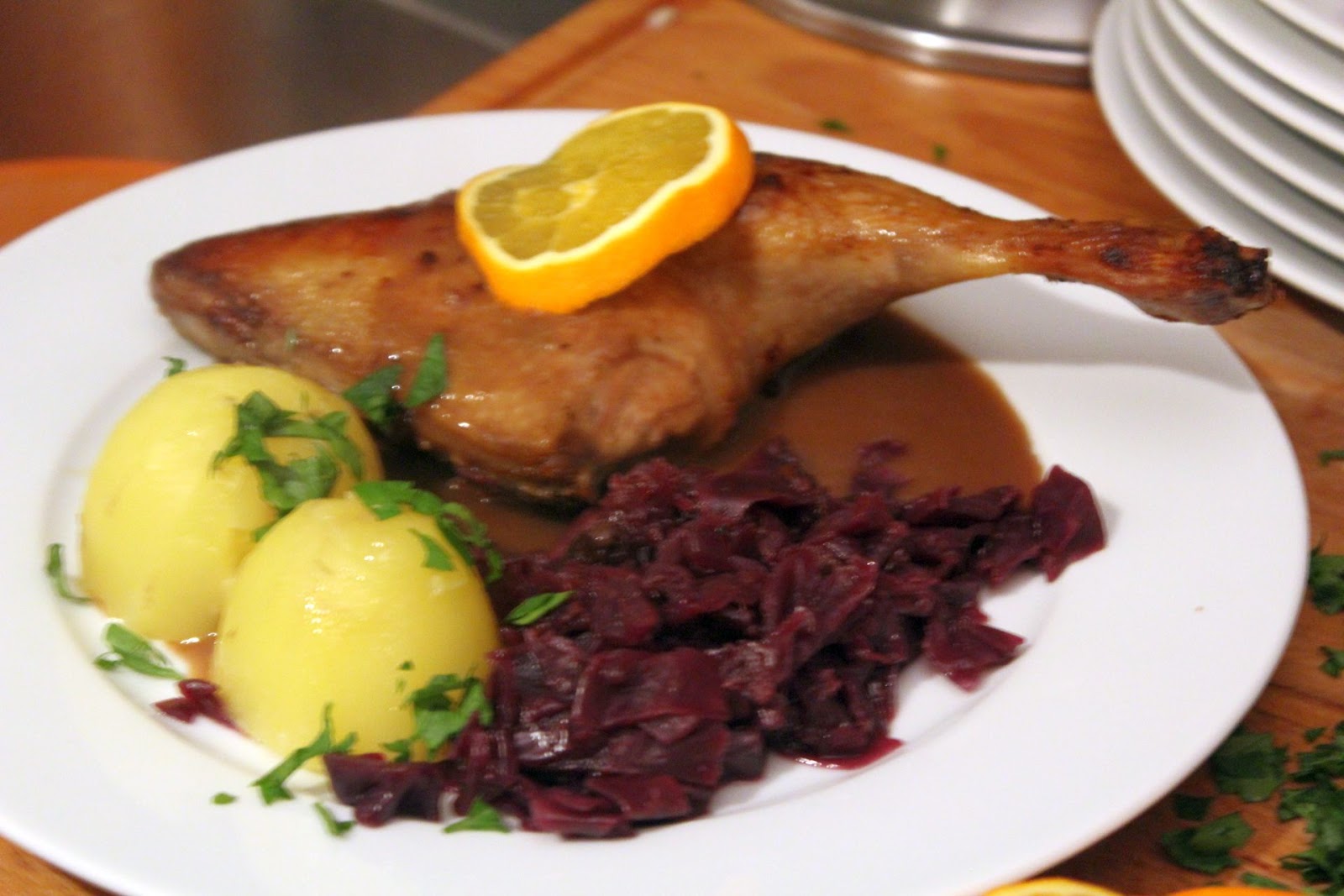 Ich habe sonst schon jede Menge Kroketten, Klöße und Tod und Teufel gemacht, dieses Jahr sagte mir aber, dass das Essen einfach mal nur sachlich und korrekt sein sollte. Das weiß heute scheinbar sowieso niemand mehr, wie das schmeckt, wenn man links und rechts davon kein Feuerwerk zum Ablenken abbrennt. Genau so schmeckt Ente mit Rotkohl!