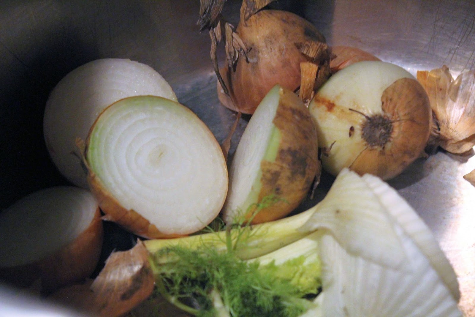 Zwiebeln halbieren, Schalen dranlassen, die geben eine schöne Farbe.