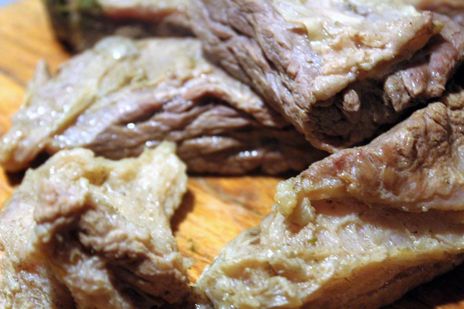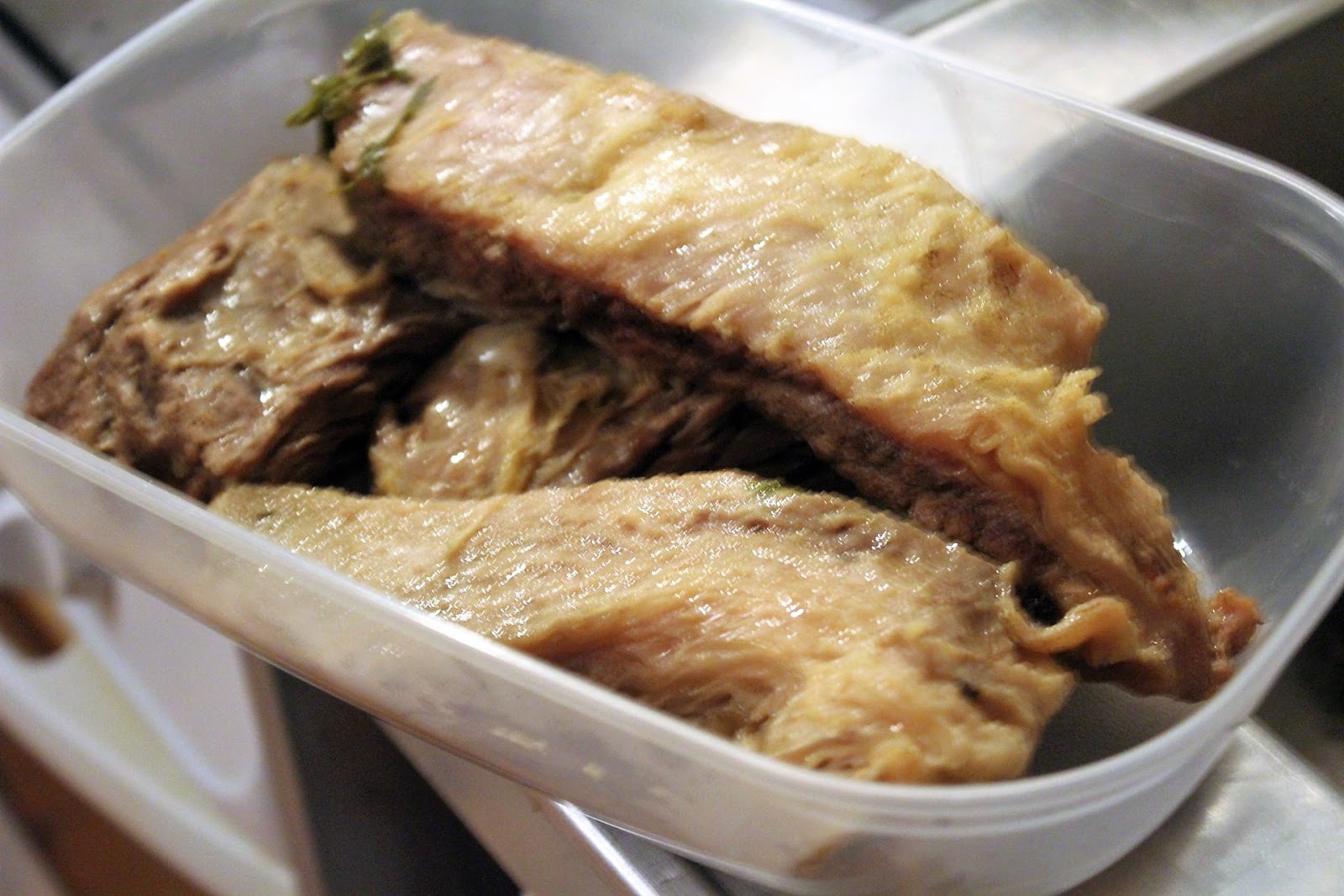 Das Fleisch ist ganz zart, das kommt in eine Gefrierdose und übernachtet im Kühlschrank