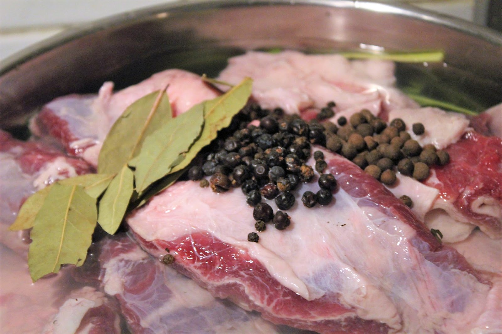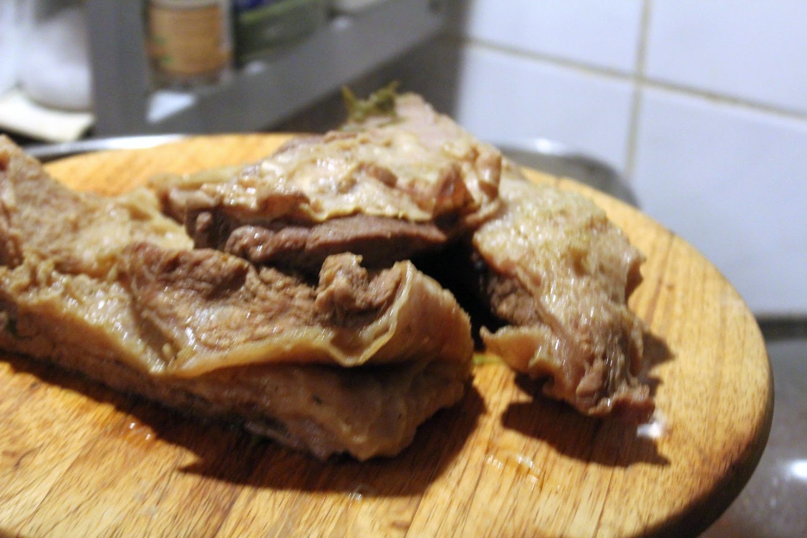 Das Fleisch fische ich mit dem Schaumlöffel aus der Brühe. Deswegen ist es gut, wenn man sich vorher schon merkt, wie viele Stücke man hatte.