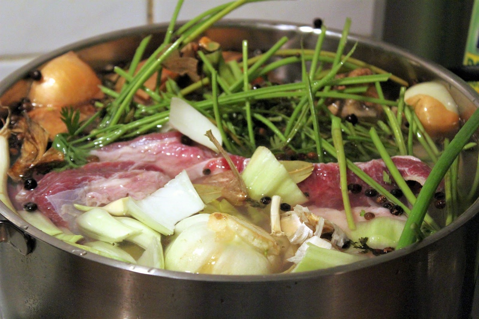 Eine Brühe hat keine feste Choreographie was die Zutaten betrifft. An normalen Tagen hätte ich noch Sellerie oder Kohlrabi verwendet, aber das war gerade aus und kam auch nicht mehr rein. Bringt auf jeden Fall Geschmack und falls Ihr für die Brühe extra einkauft, dann bringt Euch auf jeden Fall Sellerie mit. Rinderbrühe ist ein bisschen schwierig, denn theoretisch muss man sich vorher überlegen, ob die Brühe besonders kräftig wird, oder ob man das Fleisch hinterher weiter verwenden will. Wenn man das Fleisch hinterher weiter verwenden will, dann soll man das Fleisch erst reingeben, wenn die Brühe schon kocht. Wenn man mehr Wert auf eine kräftige Brühe legt, dann setzt man sie, wie ALLE anderen Brühen kalt auf und legt das Fleisch gleich mit dazu. Ich entscheide mich im Zweifel immer für die Brühe und setze sie grundsätzlich kalt auf und werfe das Fleisch auch immer gleich mit in den Topf. In finde hinterher immer einen Weg, da trotzdem noch Geschmack dran zu bekommen und es auch wieder so schonend zu erhitzen, dass es so zart bleibt, wie man es sich wünscht. Alles eine Frage der Routine, aber die bekommt Ihr jetzt ja auch.
