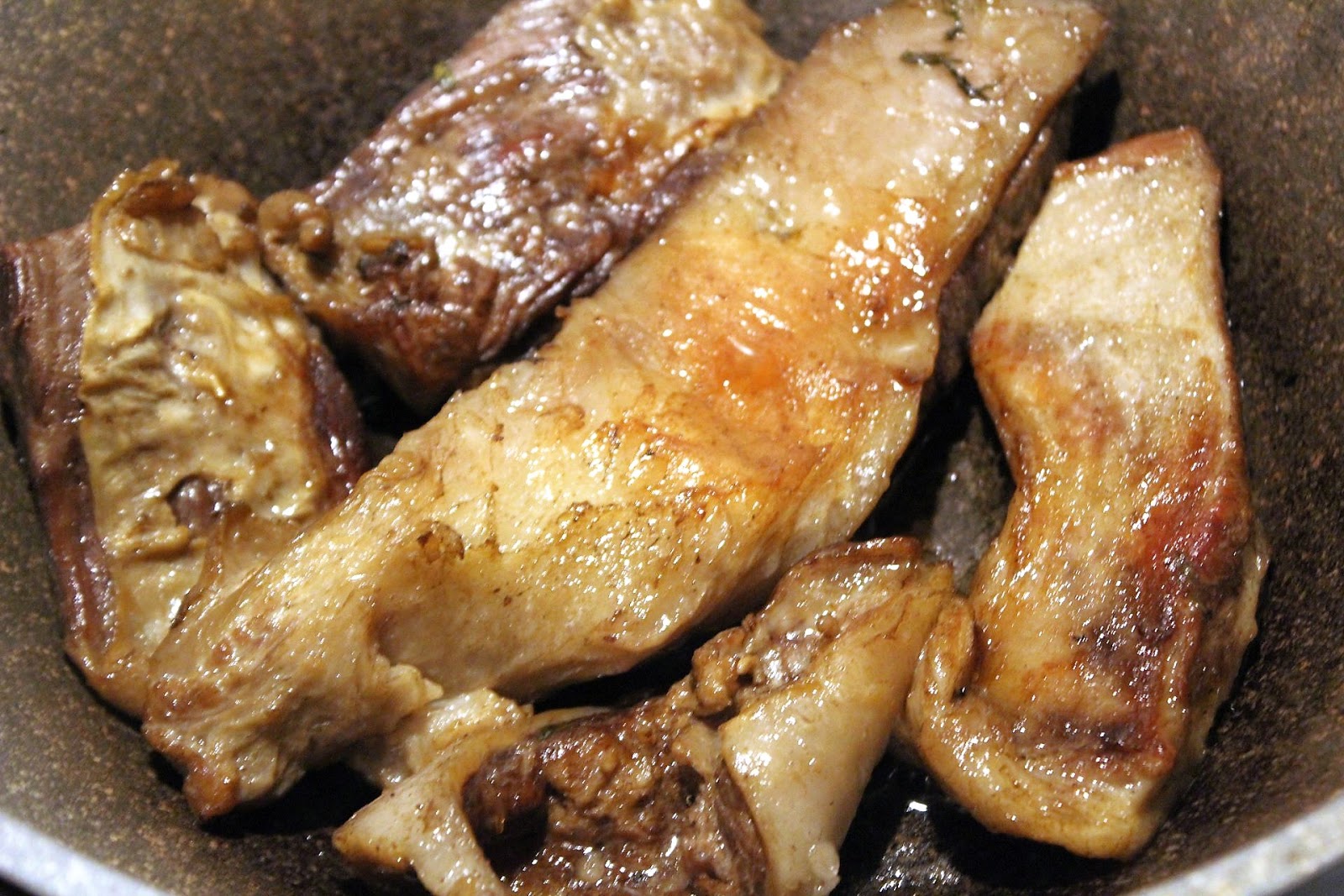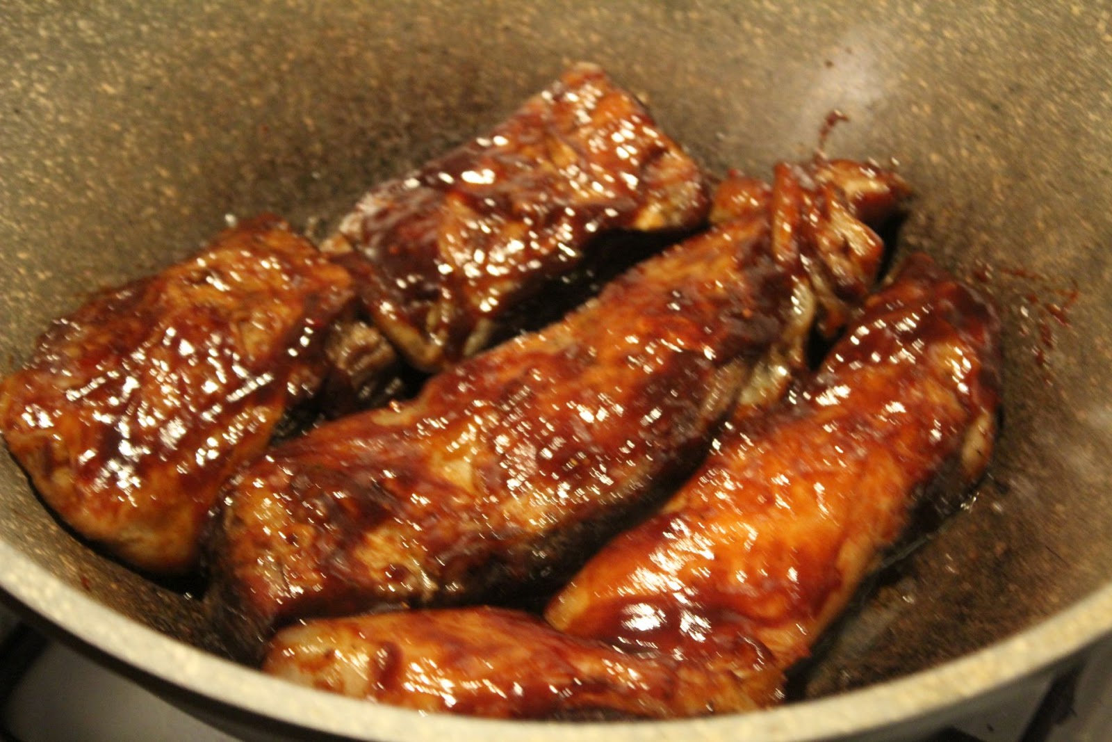 Das Fleisch fängt mit der Zeit an richtig glänzend zu werden, dann brät auch noch Fett weg und man kann in der Pfanne / Wok sehen, dass sich das Fett am Boden sammelt und beim Erhitzen ebenfalls dafür sorgt, dass das Fleisch zart wird. Das Fleisch bleibt insgesamt eine Stunde lang in der Pfanne. Nach einer halben Stunde, kommt die Glasur.