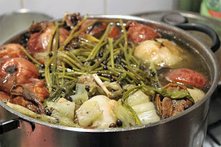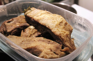 Das Fleisch war vorher drei Stunden lang in einer Rindfleischbrühe. Daraus wird es direkt wenn man den Herd abgestellt hat, mit dem Schaumlöffel entnommen und dann im Kühlschrank übernachten gelassen, damit die Fleischfaser beim Schneiden nicht ausfasert.