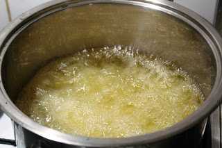 1 bis 2 Liter Pflanzenöl, ja nach Topfgröße und Familiengröße erhitzen, bis das Fett sprudelnd am Pfannenwender aufsteigt. Nicht zu viel Pommes auf einmal ins Fett werfen, sonst geht die Temperatur zu sehr in die Knie und die Kartoffeln werden nur gekocht und nicht frittiert.