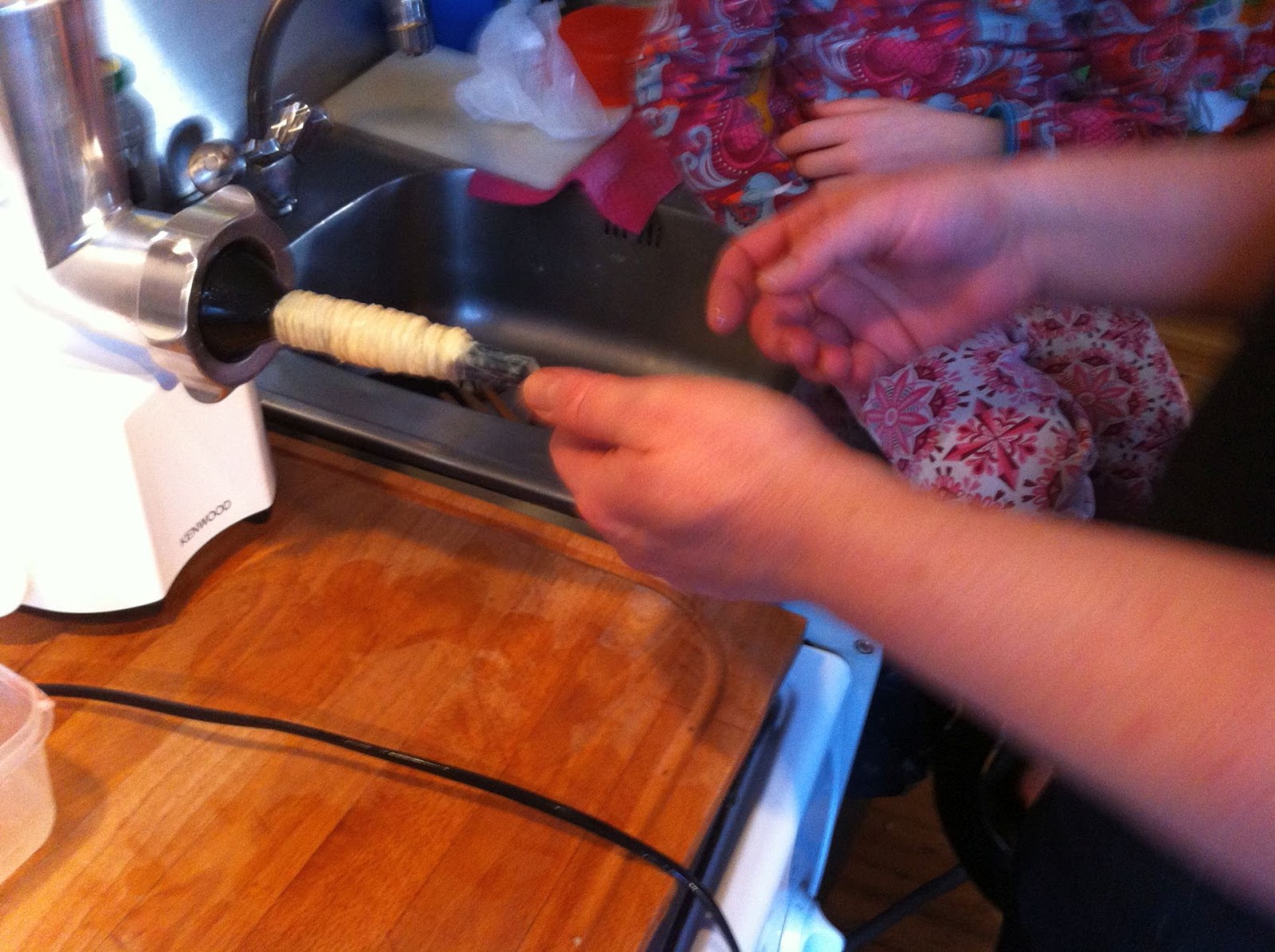Das ist übrigens ein Stück Dünndarm. Das war meinen Kindern wichtig zu wissen. Das heißt, dass da nie Scheiße drin war, sondern da findet nur eine früherer Verdauungsprozess drin statt. Bevor da Wurst hinein kommt, ist der auch mehrfach gereinigt worden.