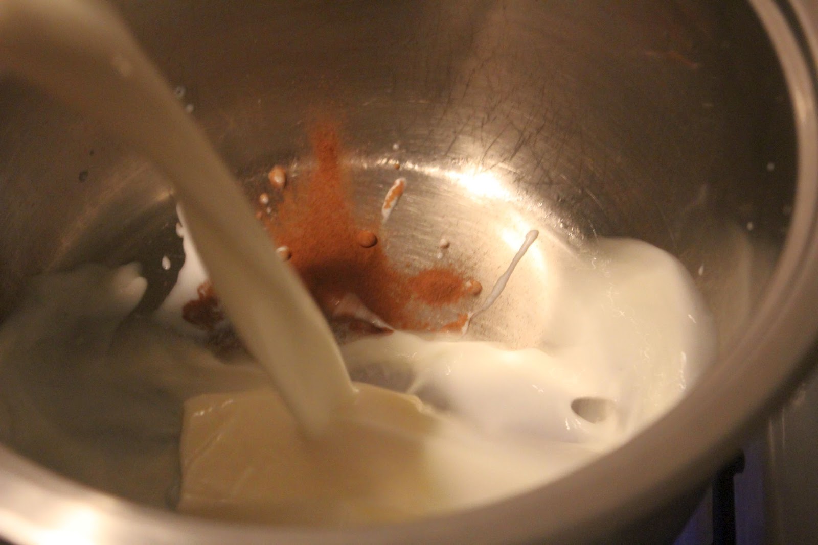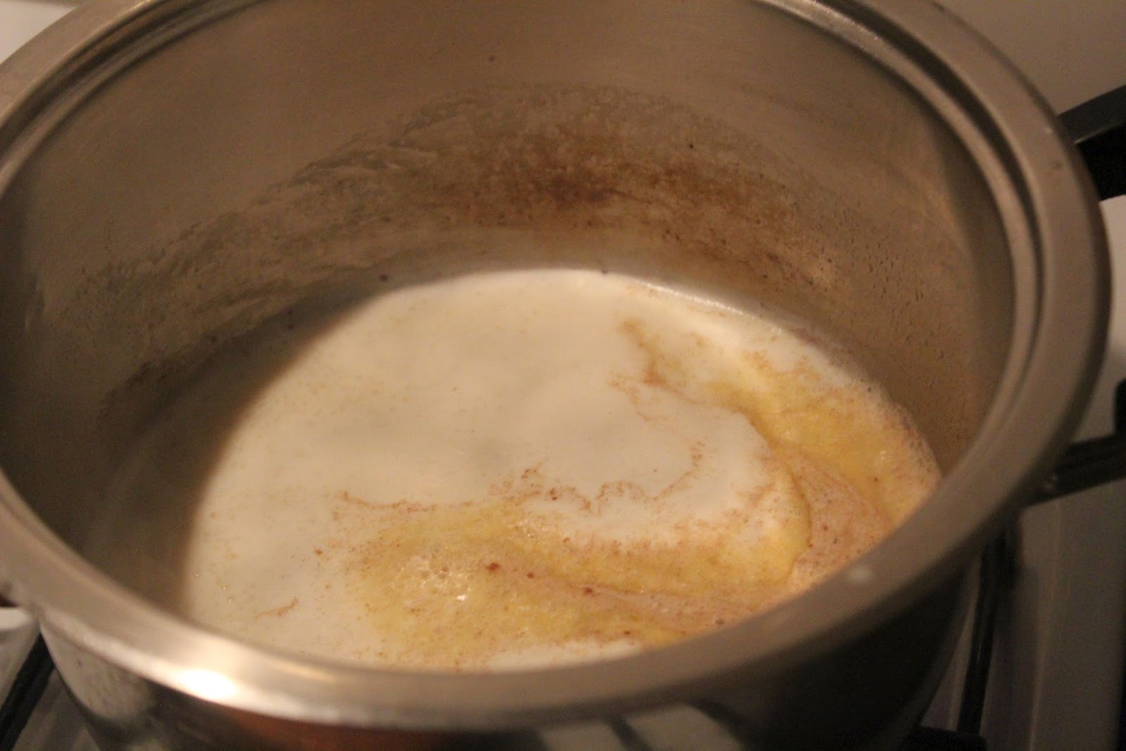 Immer mal wieder rühren, während die Butter schmilzt und die Milch dabei ist aufzukochen