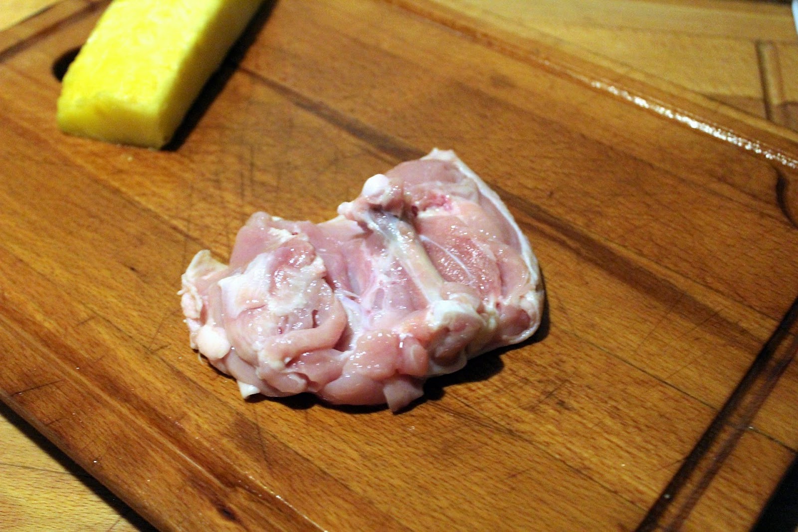 So sieht eine Hähnchenoberkeule aus. Durchzogenes Muskelfleisch mit Haut und einem Knochen
