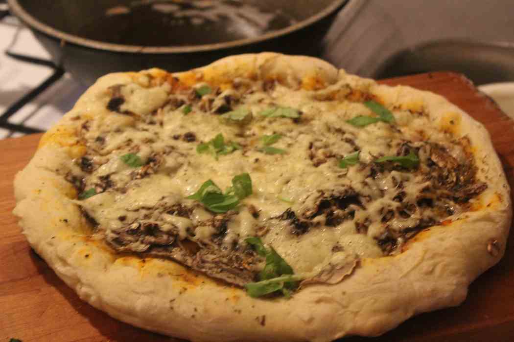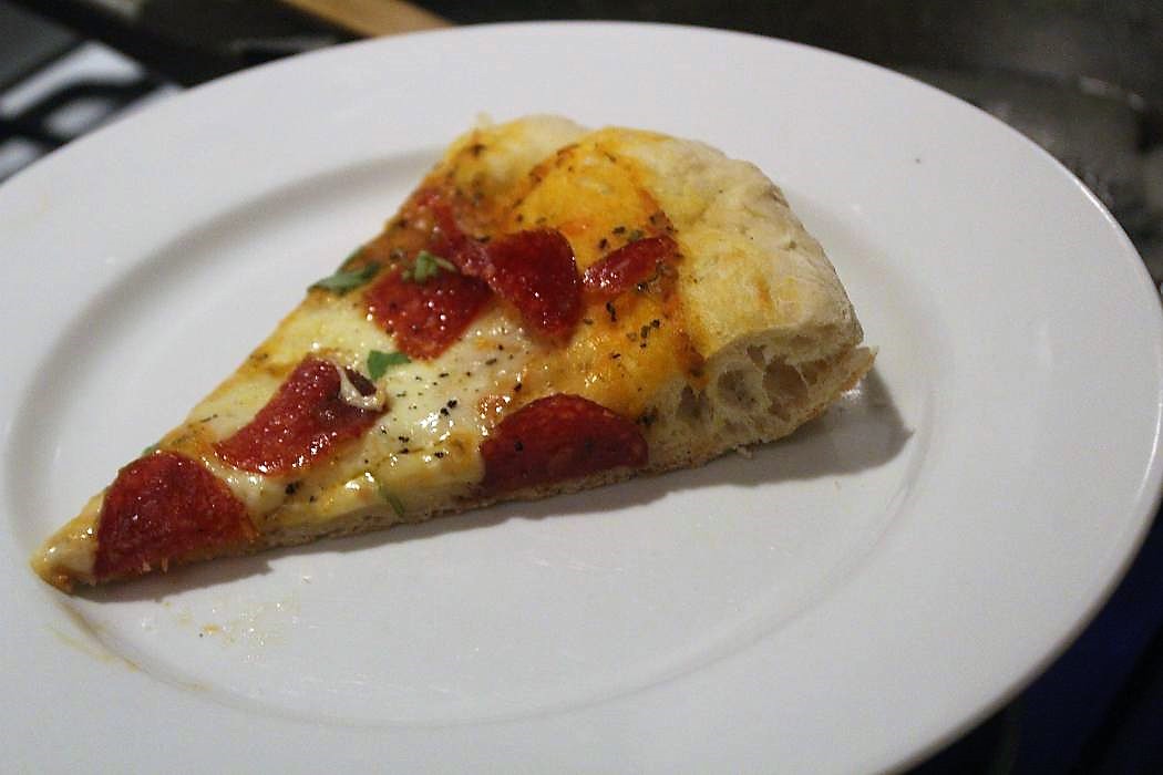 Ihr wollt wissen, wie der Teig ist? Der Teig schmeckt richtig gut, ist luftig und blasig, angenehmer Geschmack, schöne Krusten. Ich würde mich am Ende immer für einen gereiften Teig nach italienischer Machart entscheiden, wenn ich die Wahl habe, aber ich verkünde hier nicht das Evangelium. Es gibt bestimmt eine Menge Menschen, die so eine amerikanische Pizza bevorzugen und die ist wirklich toll und immer besser als der ganze lieblose Bringdienstschrott, der nur aus miesen Zutaten bestehend, lauwarm und wabbelig aus der Thermobox in der Pappschachtel lauert. Billiger kann man auch nicht satt werden, als wenn man sich seine Pizza selbst aus frischen Zutaten backt. Vielleicht noch mit selbst gemachten Nudeln.