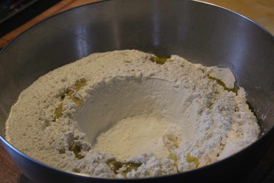 So viel von der Wasser-Hefemischung in die Mulde kippen wie reinpasst, den Rest im Litermaß stehen lassen.