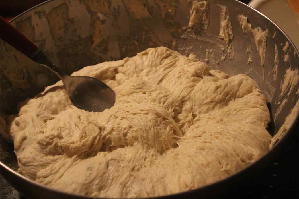 Der Teig ist so aufgegangen, dass er mir die Holzplatte von der Schüssel gehoben hat. Ich habe den Teig dann mit dem Esslöffel vom Schüsselrand gekratzt