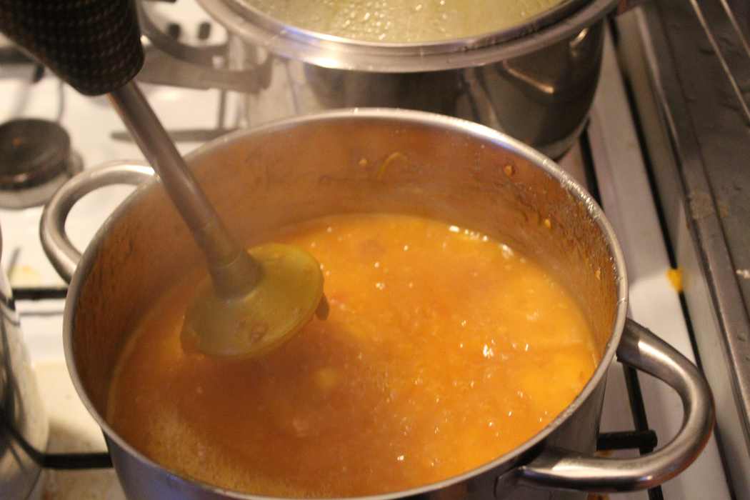 Wenn die Masse drei Minuten sprudelnd gekocht hat wird püriert.
