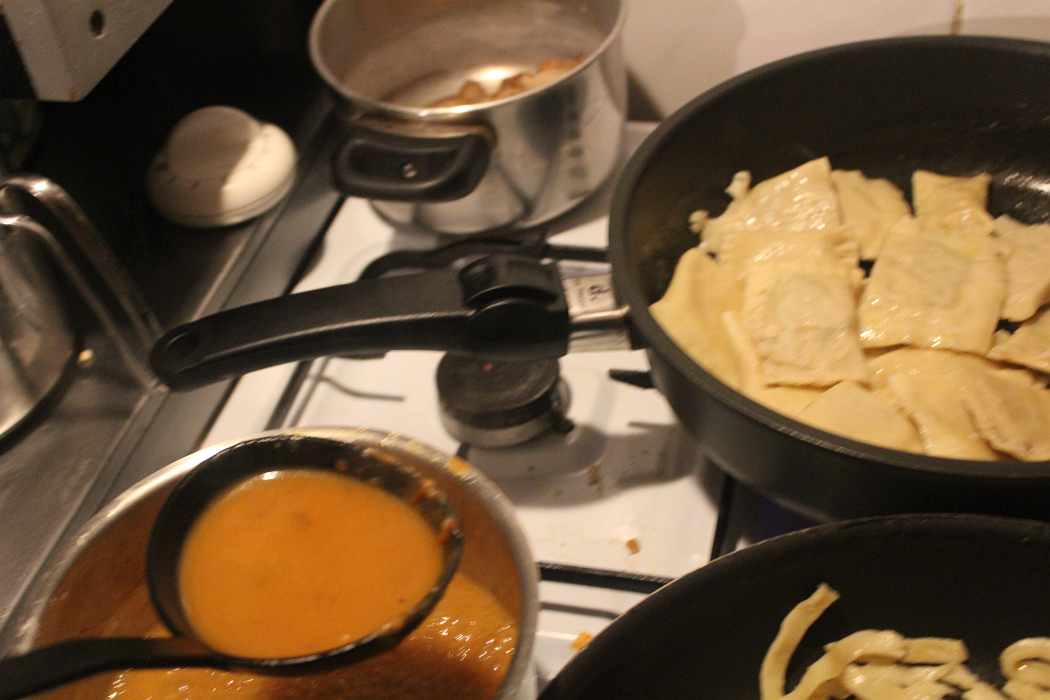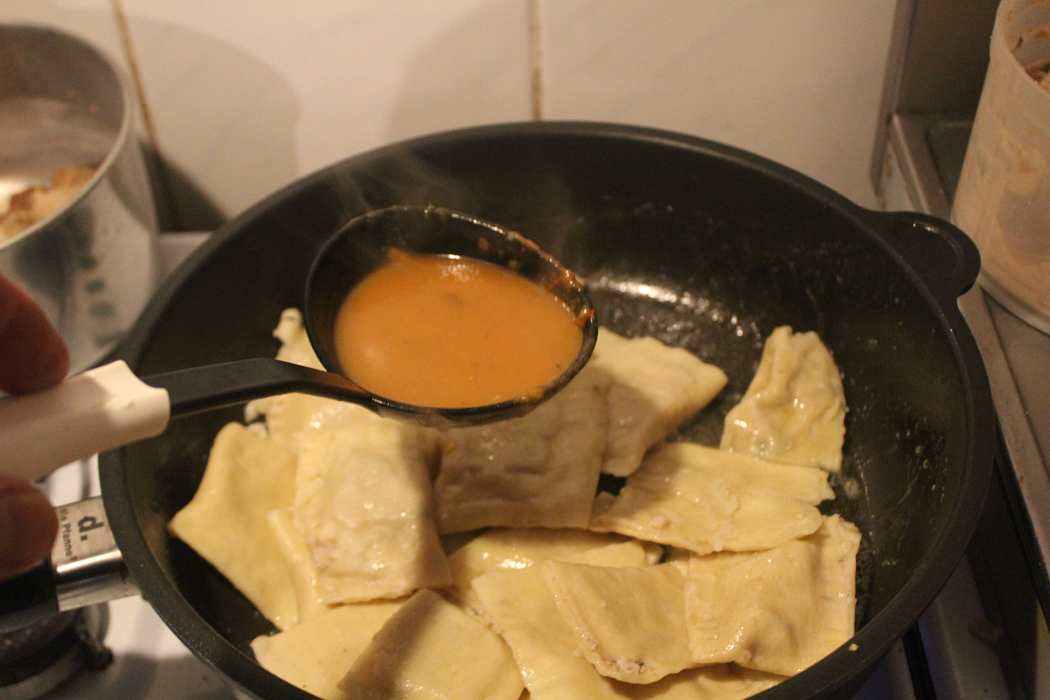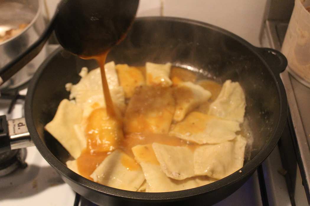 Die Soße jetzt noch mal kurz erhitzen, damit sie die Temperatur in der Pfanne nicht senkt, wenn sie mit den Ravioli vermählt wird.