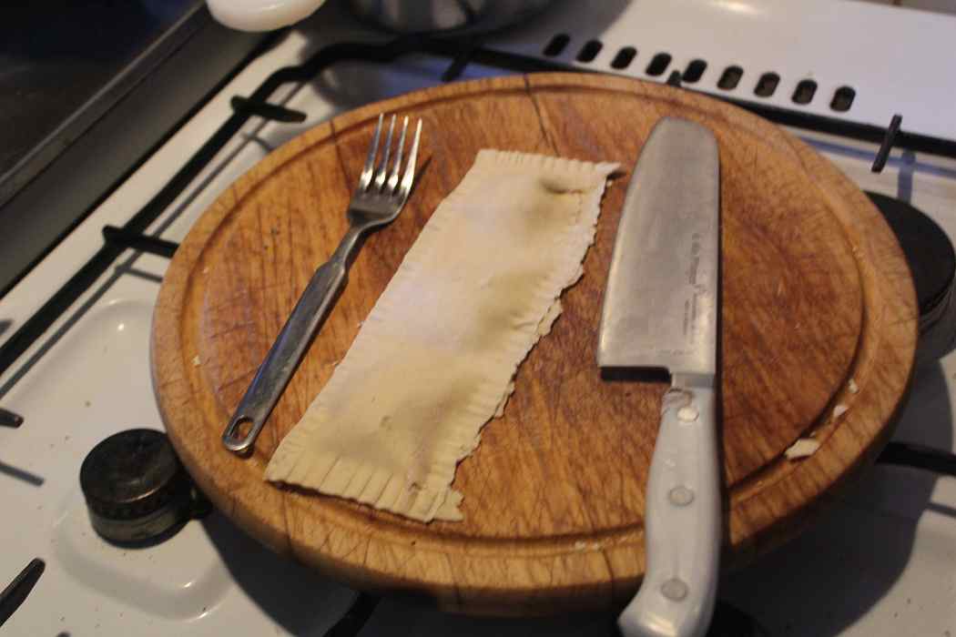 An den Rändern mit einer Gabel ein Muster in den Teig drücken, damit die Ravioli im Wasser nicht wieder aufgehen.