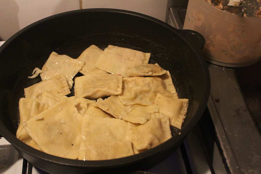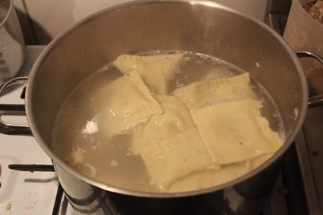 Wasser zum Kochen bringen und dann die Ravioli portionsweise ins Wasser geben. Dann soll das Wasser aber nicht mehr kochen. Herd auf kleinste Stufe stellen.