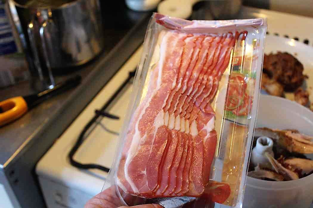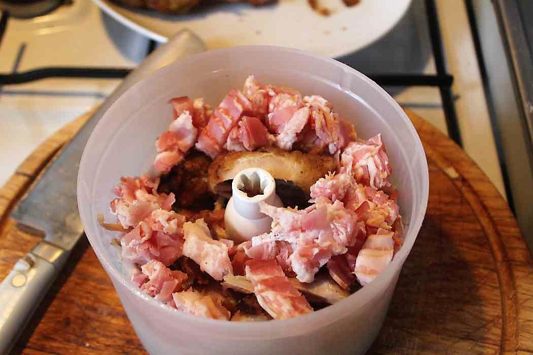 Bacon zum Hähnchenfleisch in den Mixbecher geben.