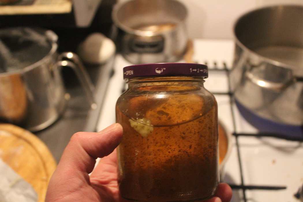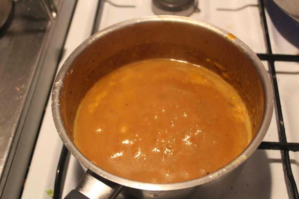 Topf auf kleinster Flamme auf der kleinsten Platte 20 Minuten lang köcheln lassen, danach ist der Mehlgeschmack weg
