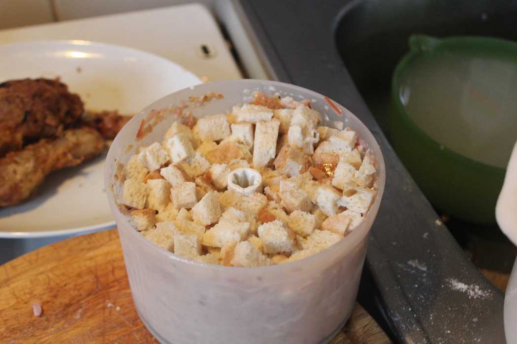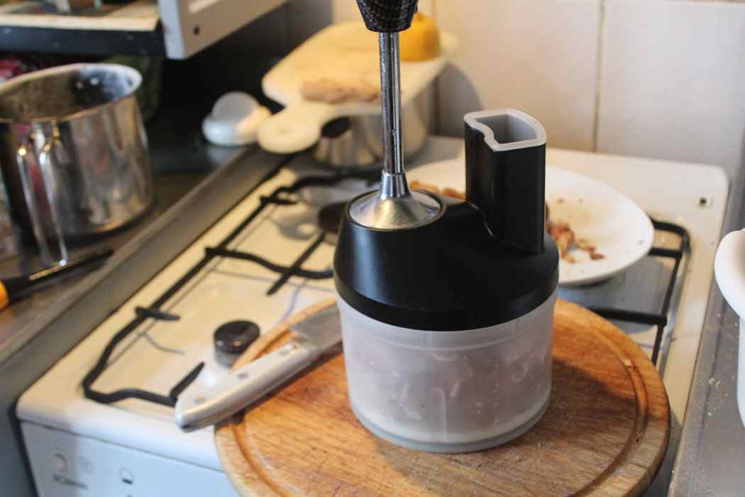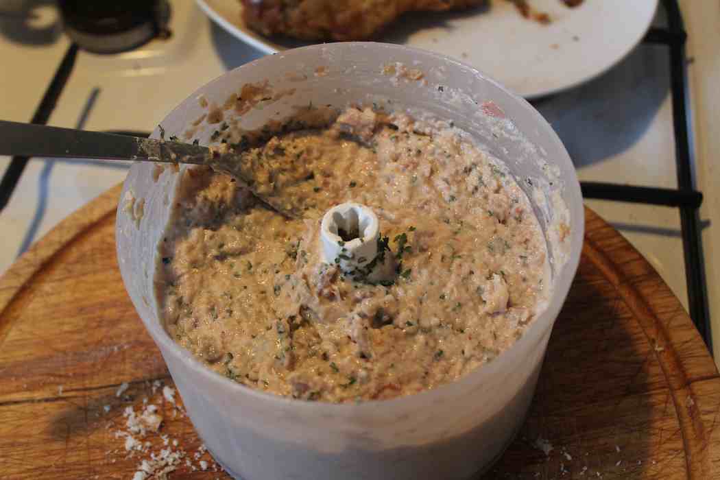 Alles was nicht Knochen und Knorpel sind, kommt in einen Mixbecher. Ihr könnt einen Pürierstab nehmen, ich verwende meine Zauberette. Wenn Euch das so vorkommt, wie die Produktion von Hähnchennuggets, bei denen alles von der Erde im Schlachthof aufgefegt wird, dann stimmt zwar die ungefähre Richtung, aber ich nehme ja nur veredelte Zutaten, die beim letzten Abendessen schon mal richtig gut geschmeckt haben.