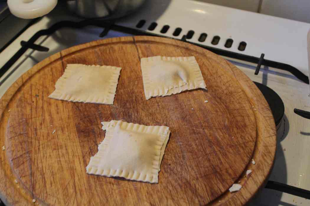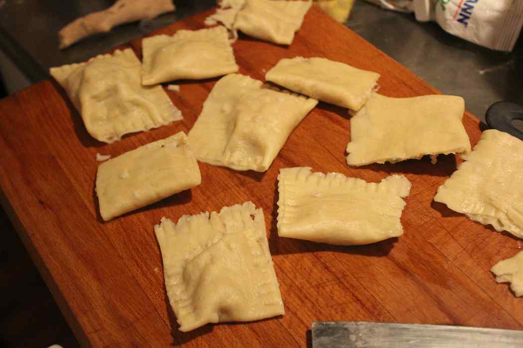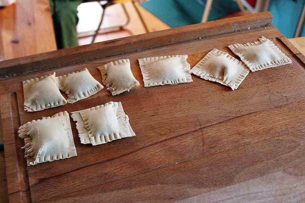 Gefüllten Teig in möglichst gleichgroße Ravioli schneiden.