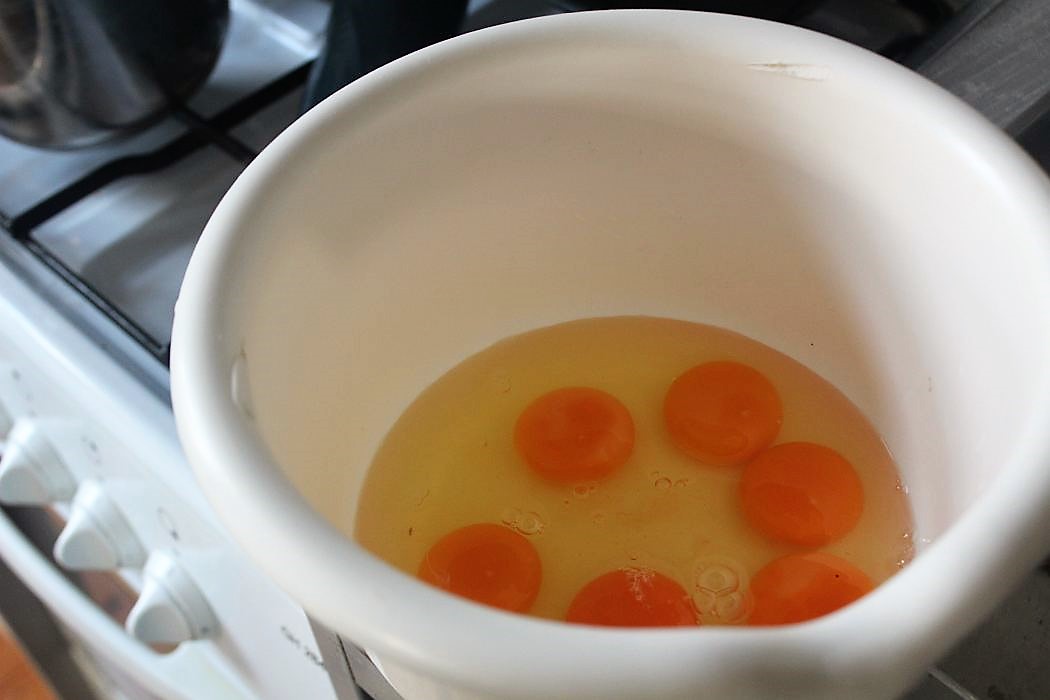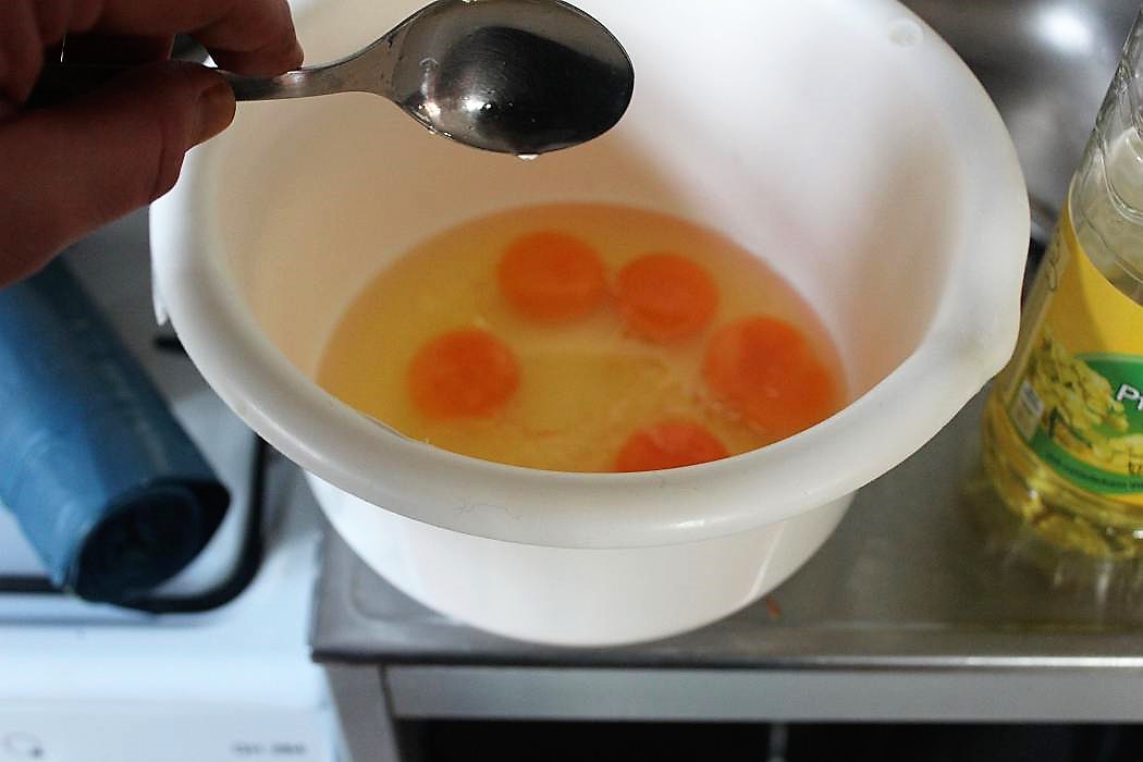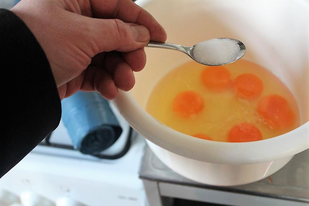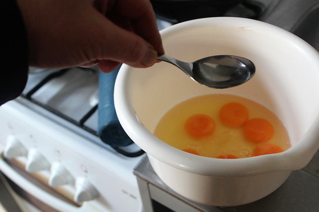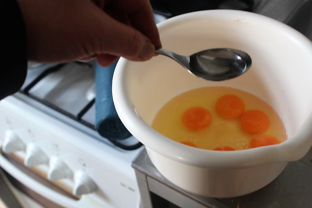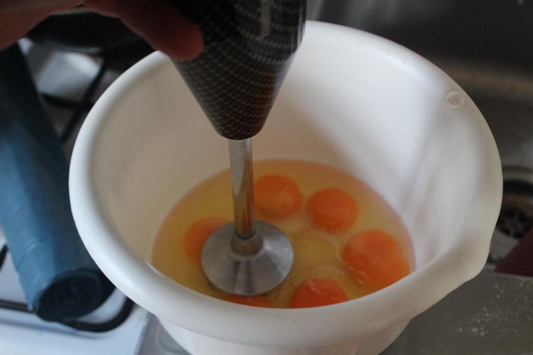 Eier verquirlen, dann nach und nach Mehl in die Schüssel geben, sobald es beim Rühren abgebunden hat.