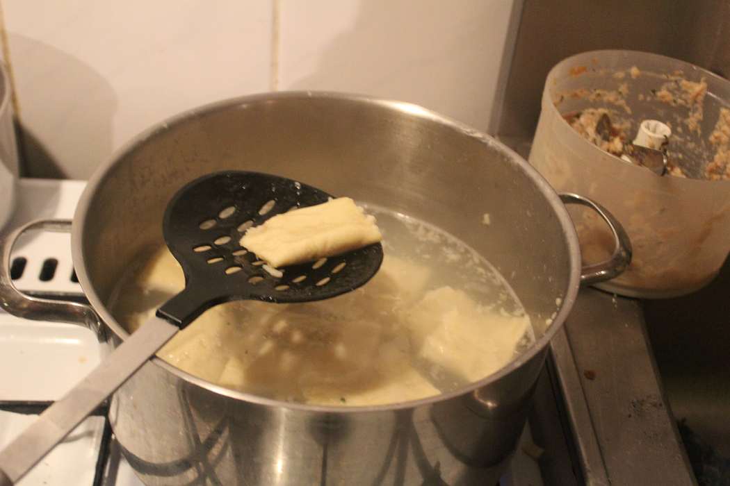 Wenn die Ravioli aufsteigen, sind sie gar und können mit dem Schaumlöffel aus dem Wasser gehoben werden