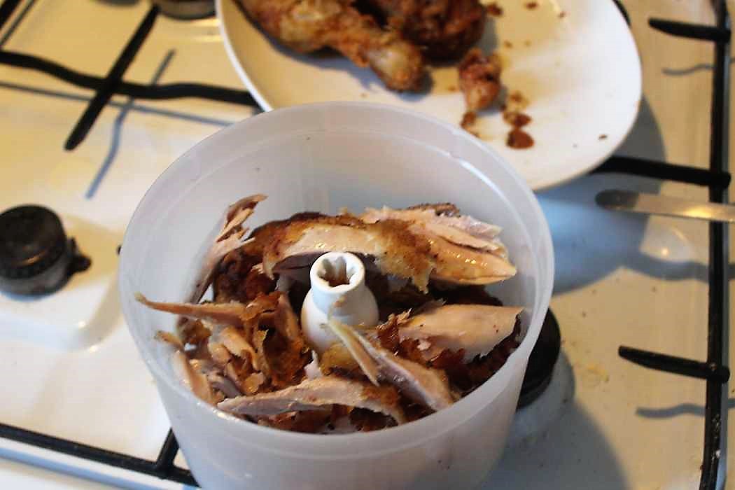 Nun machen wir schnell die Füllung. Ihr seid da vollkommen frei und könnt auch 300 Gramm rohe Hähnchenbrust nehmen. Ich habe noch Reste von meinen Drumsticks à la KFC, weil meine Kinder beim Essen nicht so richtig mitgemacht haben.