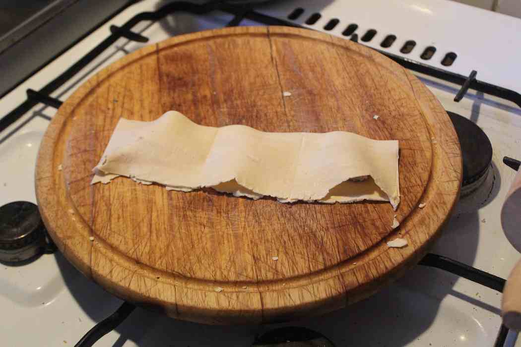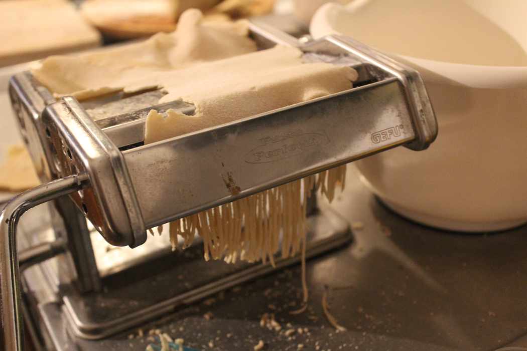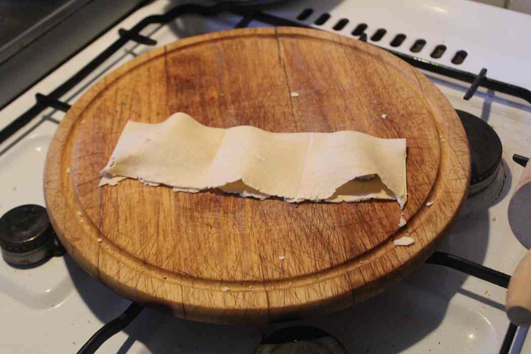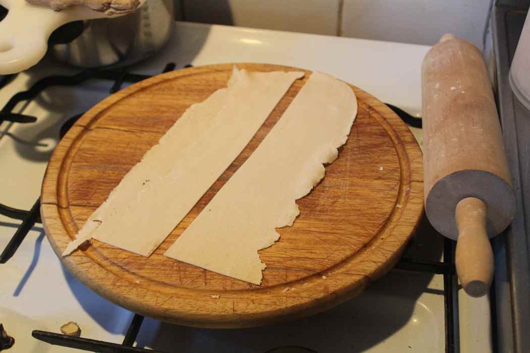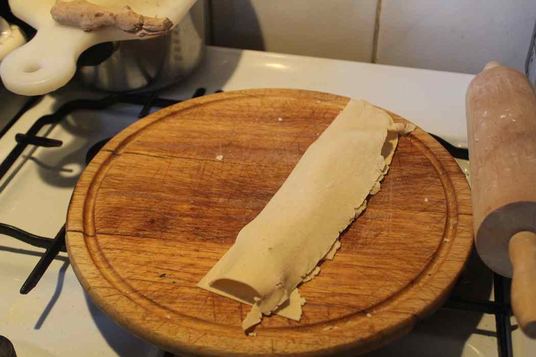Den Nudelteig mit dem Nudelholz auf einem Holzbrett auswalzen, oder mit der Nudelmaschine in dünnen Bahnen ausrollen.