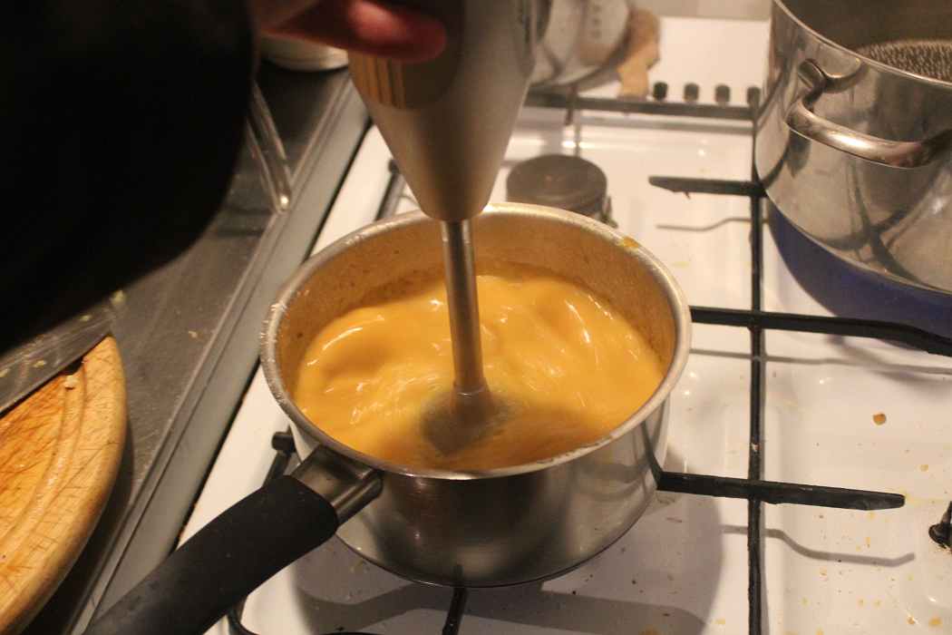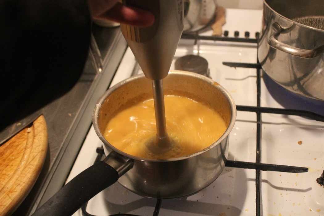 Mit dem Pürierstab oder Zauberstab vermischen, damit die Mehlklumpen weg sind
