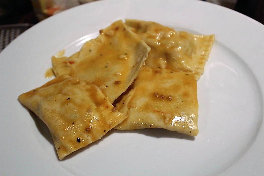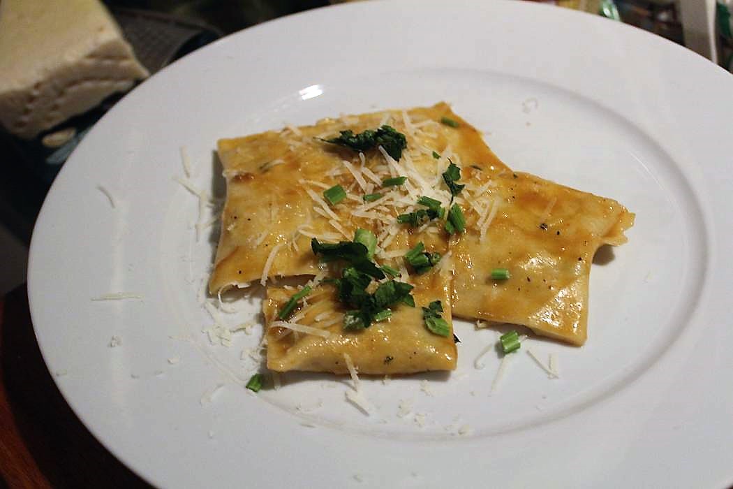 Ravioli auf flachen oder tiefen Tellern anrichten