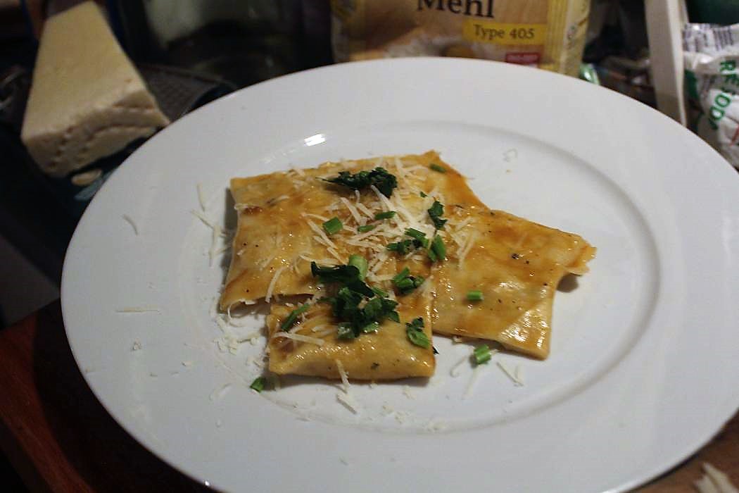 Jetzt kommt der große Moment, wenn die Ravioli leicht Farbe angesetzt haben. Spätestens jetzt ist die Füllung gar, für alle die Angst vor dem alternativ zu verwendenden rohen Huhn haben, weil sie nicht den Umweg über meine bereits gegarten Keulen gehen möchten.