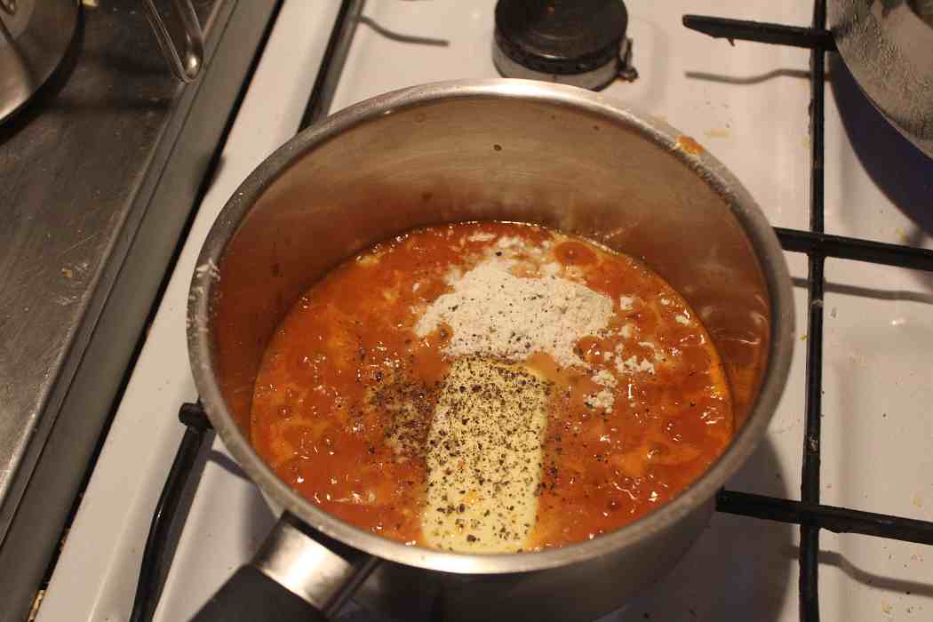 Brühe dazu gießen, Herd auf volle Pulle stehen, bis die Butter geschmolzen ist.