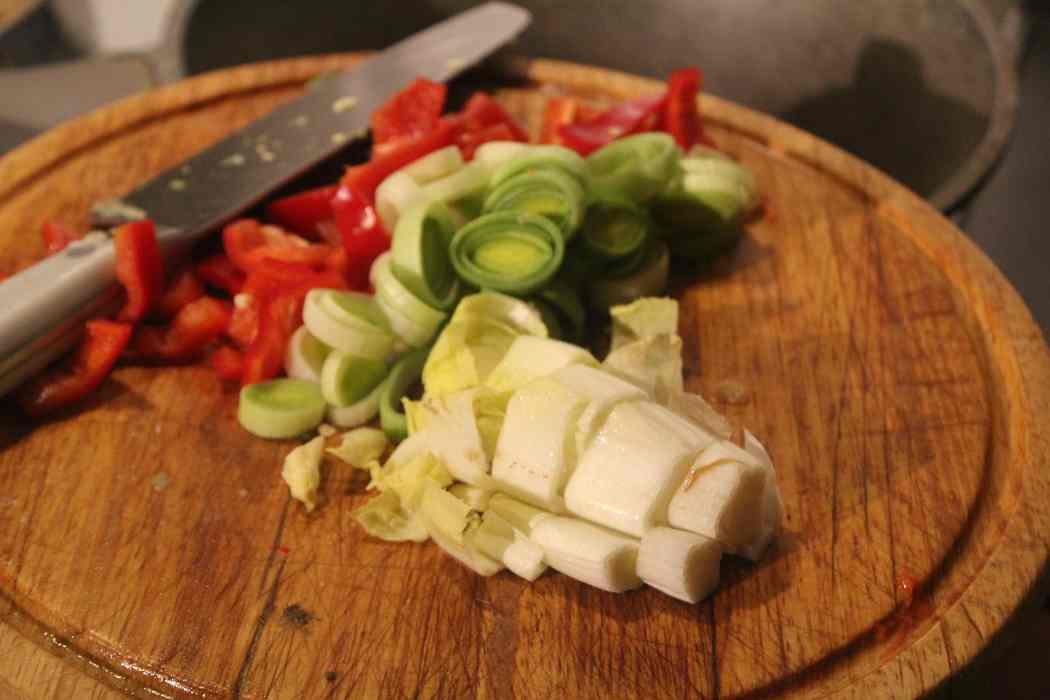 Chicoree, Spitzpaprika und Porree zerkleinern.