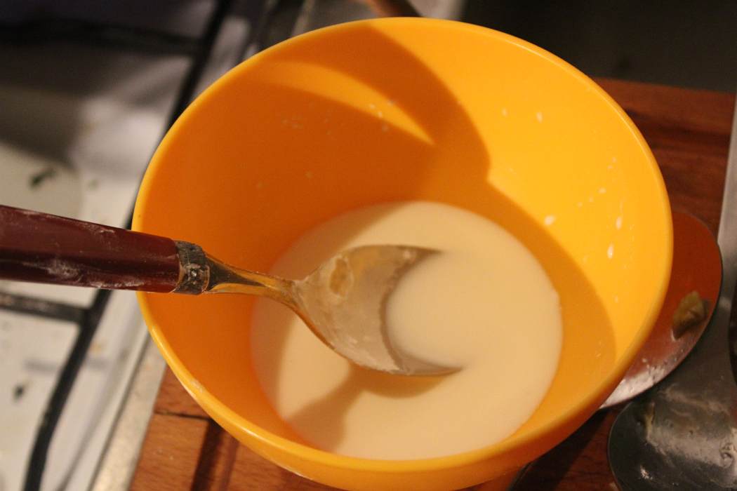 Einen Esslöffel Speisestärke mit Wasser auflösen.